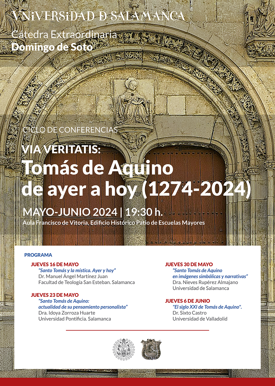 La Cátedra de Teología “Domingo de Soto” de la Universidad de Salamanca conmemora el 750 aniversario del fallecimiento de Santo Tomás de Aquino, patrón de las universidades y escuelas católicas, con un nuevo ciclo de conferencias. Bajo el lema: “Via veritatis: Tomás de Aquino de ayer a hoy (1274-2024)”, este ciclo contempla cuatro ponencias abiertas que se llevarán a cabo los jueves, del 16 de mayo al 6 de junio, a las 19:30 horas en el aula Francisco Vitoria del Edificio histórico de la Universidad de Salamanca.