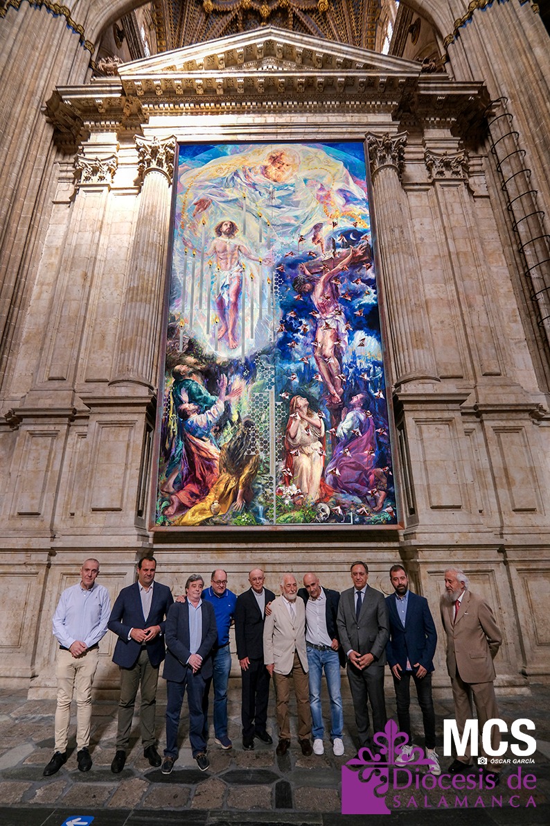 El sueño del canónigo emérito Daniel Sánchez se ha materializado en el muro que estaba desnudo tras el altar de la Catedral Nueva de Salamanca, con la inauguración de la obra: “El pensamiento ante el misterio de la Creación, Redención y Resurrección”, del pintor Florencio Maíllo. Esta pintura, encargada por el fallecido canónigo, se alza imponente con sus 8×4 metros, llenando ese espacio y creando un rincón especial en el que se establece un diálogo artístico y espiritual con la talla románica del “Cristo de las Batallas” y la contemporánea, “Cristo vuelve a la vida” de Venancio Blanco, ubicadas frente a él.