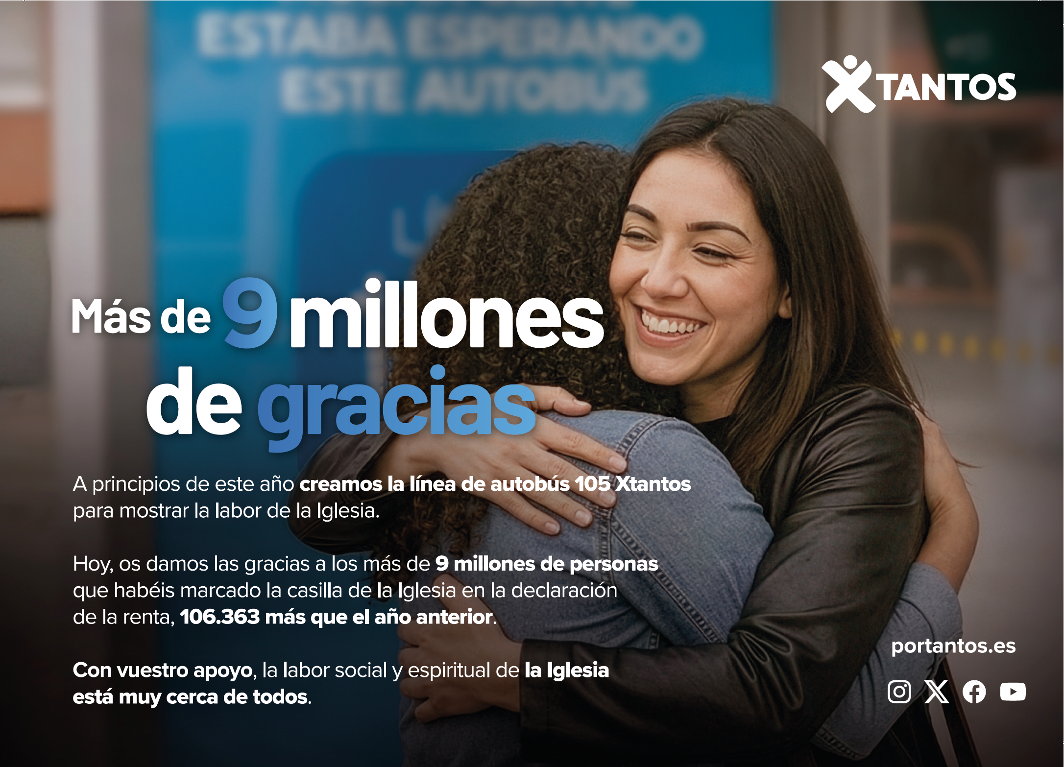 La Conferencia Episcopal ha lanzado este año la campaña de agradecimiento “Más de 9 millones de gracias”, destinada a todas las personas que marcan la X en su declaración. Un gesto libre y gratuito que no implica pagar más impuestos ni recibir menos devolución, y que permite sostener la actividad pastoral, la acción social y el acompañamiento espiritual en parroquias, Cáritas y diversas iniciativas eclesiales.