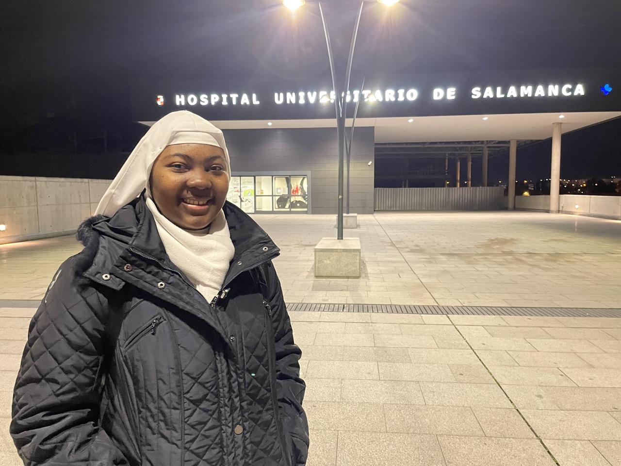 Otra de las hermanas es Sor Melani, una joven de Camerún, que sale de casa rumbo al hospital. Antes de marchar, como dicta la tradición, se reza un Ave María en la portería. Ella lo vive así: “Salgo confiando en el Señor. Le entrego al enfermo y me entrego yo también”.