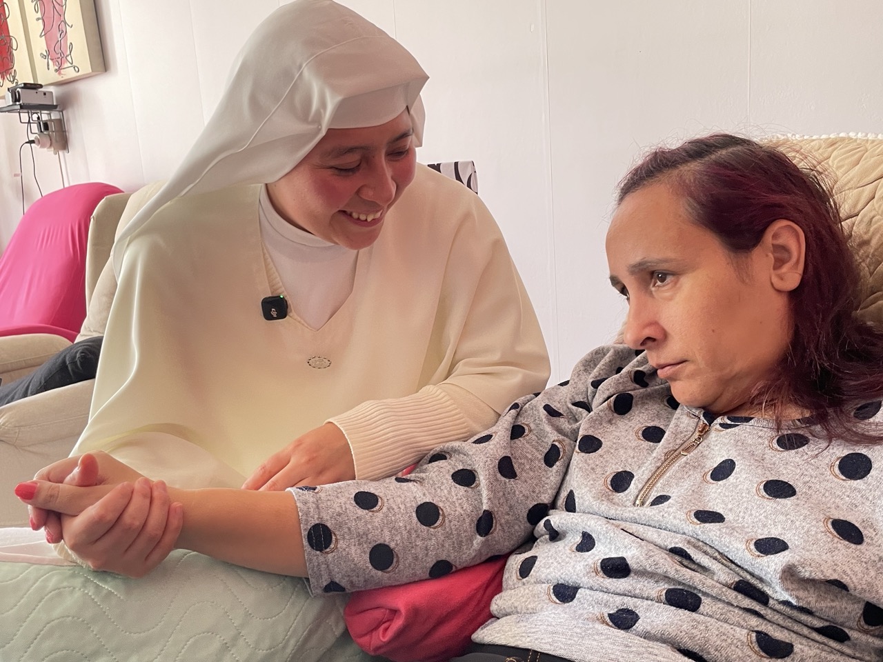 Otra de las hermanas es Sor Carmen, cuya historia está entretejida con la de una familia que vive uno de los procesos más duros y delicados, como es el cuidado de Patricia, enferma de Huntington. Esta Sierva de María recuerda que la primera vez que vine, “me impactó, y busqué la enfermedad para saber cómo acercarme y entendí que no podía hacerlo sin oración”.