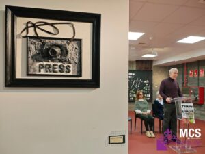 Lucía Vicente, agradecida y emocionada, cerró el acto. La artista reconoció haber trabajado “un año entero bajo el impacto de esas imágenes tremendas” de Palestina y de Gaza que llegaban a diario de los medios. “Cada día era una inspiración verlos”. Sus obras, elaboradas con materiales reciclados de su larga trayectoria en el escaparatismo y combinadas con fotografías y fotomontajes buscan en esta muestra, como ella misma expresó: ser “un lugar de recogimiento”, un espacio para que algo pueda renacer.