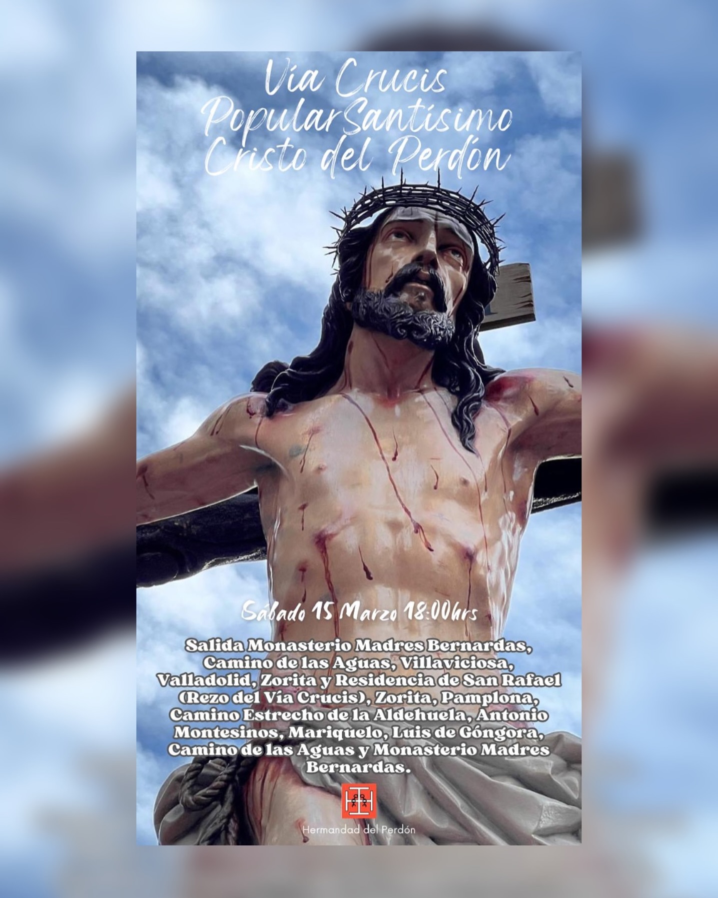 ✅ La Hermandad de Nuestro Padre Jesús del Perdón y María Santísima de Gracia y Amparo celebra un VÍA CRUCIS POPULAR con la imagen de su titular NUESTRO PADRE JESÚS DEL PERDÓN por las calles del Barrio Prosperidad a las 18:00 horas, desde el Monasterio de las RRMM Bernardas.