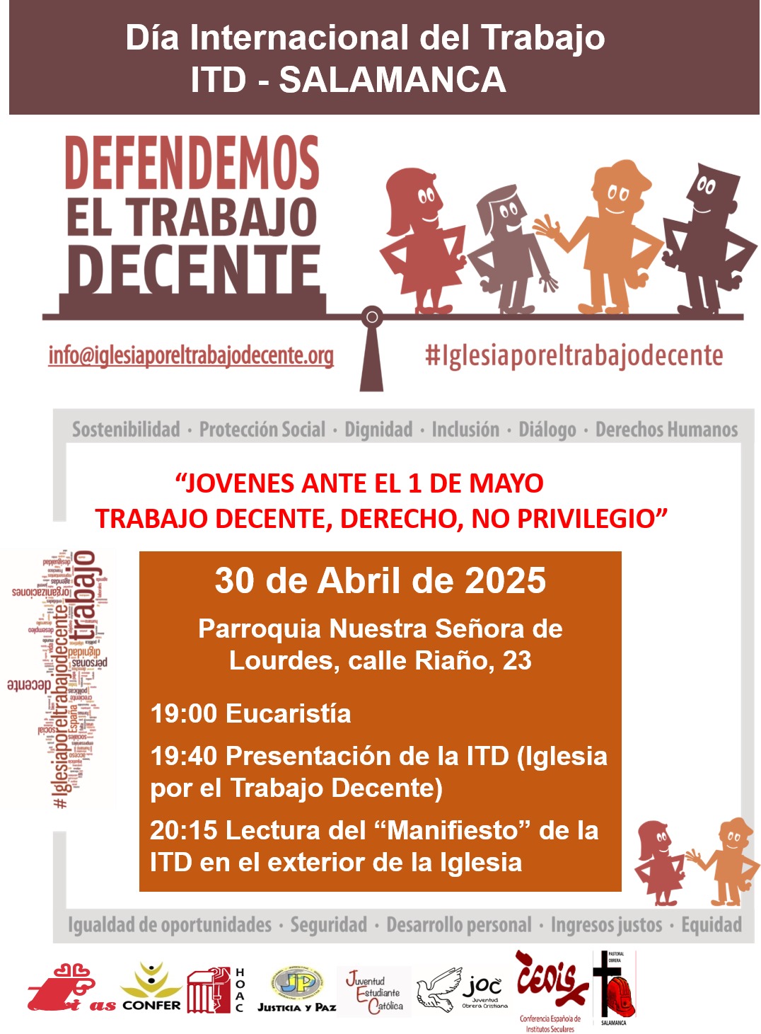 ✅ Desde Iglesia por el Trabajo Decente, te invitamos a las actividades por el 1 de mayo 🗓️ este miércoles 30 de abril a las 19:00h en la Parroquia de Nuestra Señora de Lourdes.