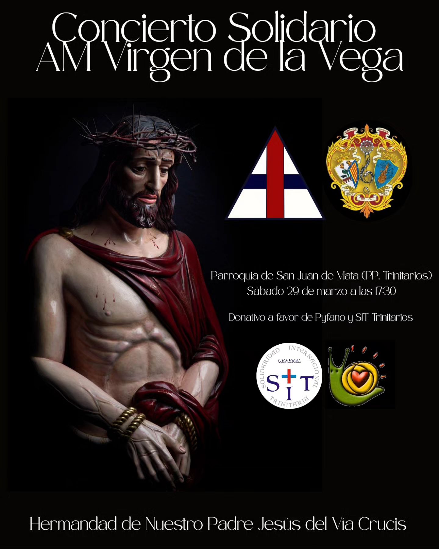 ✅ La Hermandad de Nuestro Padre Jesús del Vía Crucis ha organizado un CONCIERTO SOLIDARIO A FAVOR DE PYFANO y SIT TRINITARIOS el día 29 de marzo en el que participará la AGRUPACIÓN MUSICAL VIRGEN DE LA VEGA de Salamanca.