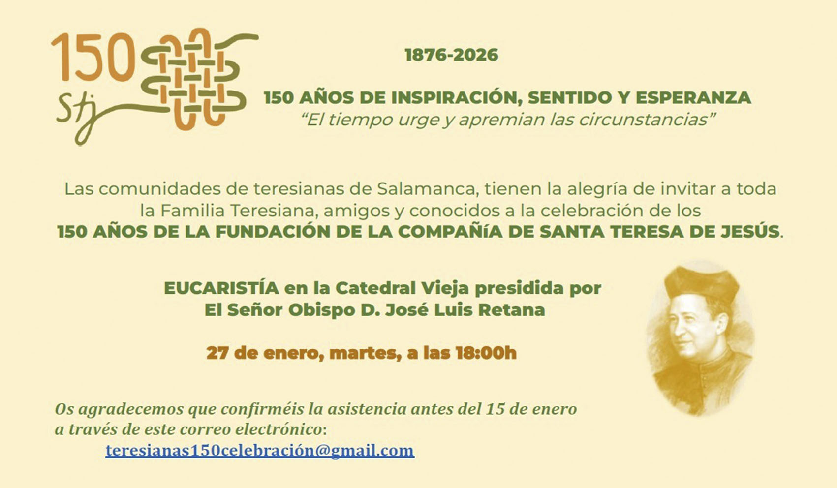 ✅ Las Comunidades de Teresianas de Salamanca celebrarán una EUCARISTÍA por los 150 AÑOS DE LA FUNDACIÓN DEL A COMPAÑÍA DE SANTA TERESA DE JESÚS el martes 27 de enero a las 18:00 horas y será presidida por el obispo Mons. José Luis Retana.