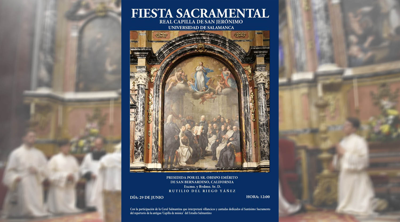 ✅ La Real Capilla de San Jerónimo acogerá este domingo, 29 de junio, a las 12:00 horas, la solemne celebración de la Fiesta Sacramental en la Infraoctava del Corpus Christi, conforme al rito tradicional que mantiene viva esta centenaria devoción universitaria. La eucaristía estará presidida por el obispo emérito de San Bernardino (California), Mons. Rutilio del Riego Yáñez, y contará con …