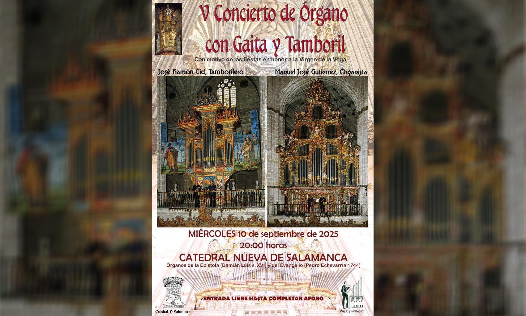 ✅ La SIB CATEDRAL DE SALAMANCA ha organizado el V CONCIERTO DE ÓRGANO CON GAITA Y TAMBORIL en la SIB CATEDRAL NUEVA con motivo de las fiestas en honor a la Virgen de la Vega a las 20:00 h. Entrada libre hasta completar aforo. + Órganos de la Epístola (Damián Luis s. XVI) y del …