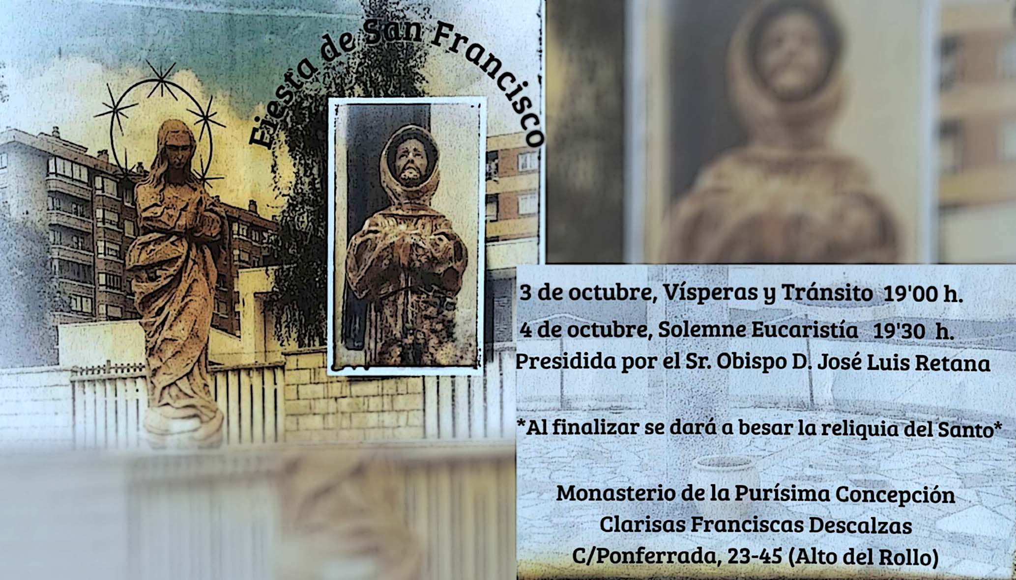 ✅ Con motivo de la Festividad de San Francisco, las Clarisas Franciscas Descalzas del Monasterio de la Purísima Concepción, en calle Ponferrada 23, celebrarán el día 3 de octubre, Vísperas y Tránsito a las 19:00 horas. El día 4 de octubre a las 19:30 horas, Solemne Eucaristía que será presidida por nuestro Obispo, D. José …