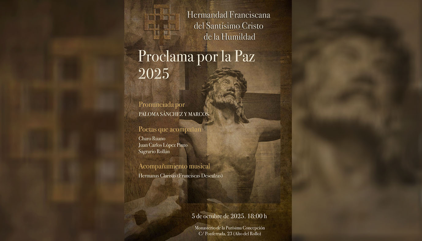 ✅ El próximo domingo, 5 de octubre, la Hermandad Franciscana del Santísimo Cristo de la Humildad de Salamanca celebrará la PROCLAMA POR LA PAZ 2025 que será pronunciada por Dª. Paloma Sánchez y Marcos. Estará acompañada por los poetas Charo Ruano, Juan Carlos López Pinto y Sagrario Rollán, con el acompañamiento musical de las Hermanas …