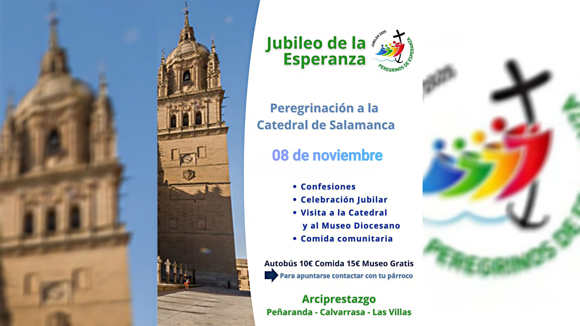 ✅ El ARCIPRESTAZGO PEÑARANDA-CALVARRASA-LAS VILLAS a organizado una PEREGRINACIÓN A LA CATEDRAL DE SALAMANCA por el JUBILEO DE LA ESPERANZA para el día 8 de noviembre, donde habrá confesiones, celebración jubilar, visita a la Catedral, al Museo Diocesano y comida comunitaria. ➡ Para apuntarse contactar con el párroco. Autobus 10 €, Comida 15€, Museo Gratis