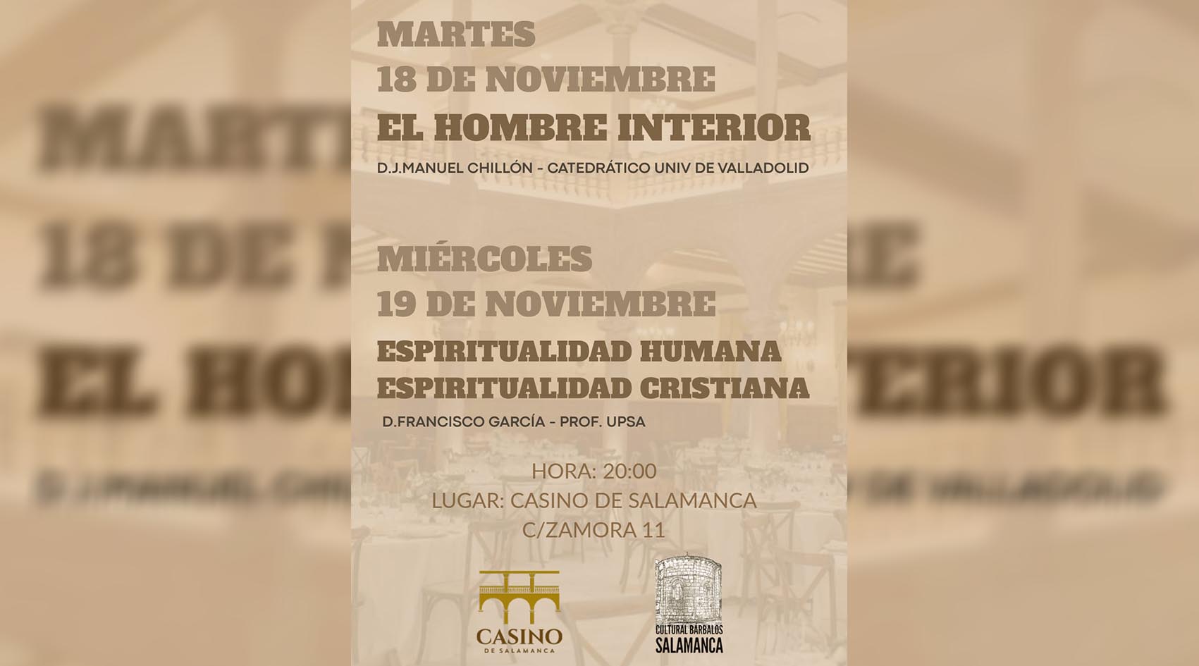 ✅ CULTURAL BARBALOS SALAMANCA ha organizado dos CONFERENCIAS para los días 18 y 19 de noviembre a las 20:00 horas. MARTES 18 de noviembre "EL HOMBRE INTERIOR" por D. José Manuel Chillón, Catedrático de la Universidad de Valladolid MIÉRCOLES 19 de noviembre "ESPIRITUALIDAD HUMANA, ESPIRITUALIDAD CRISTIANA" por D. Francisco García, Profesor de la Universidad Pontificia …