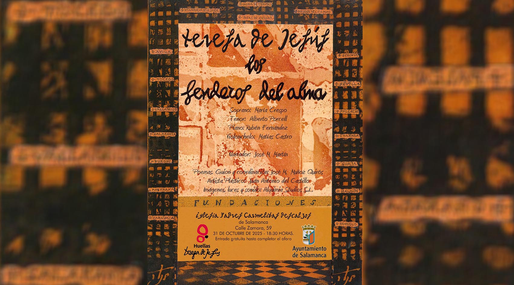 ✅ MÚSICA Y POEMAS "TERESA DE JESÚS, LOS SENDEROS DEL ALMA" en la Iglesia Padres Carmelitas Descalzos el día 31 de octubre a las 18:30 horas. Soprano: María Crespo Tenor: Alberto Porcell Piano: Rubén Fernández Violonchelo: Matías Castro Narrador: José M. Martín Poemas, Guion y Coordinación: José M. Muñoz Quirós Artista Plástico: Juan Antonio del …