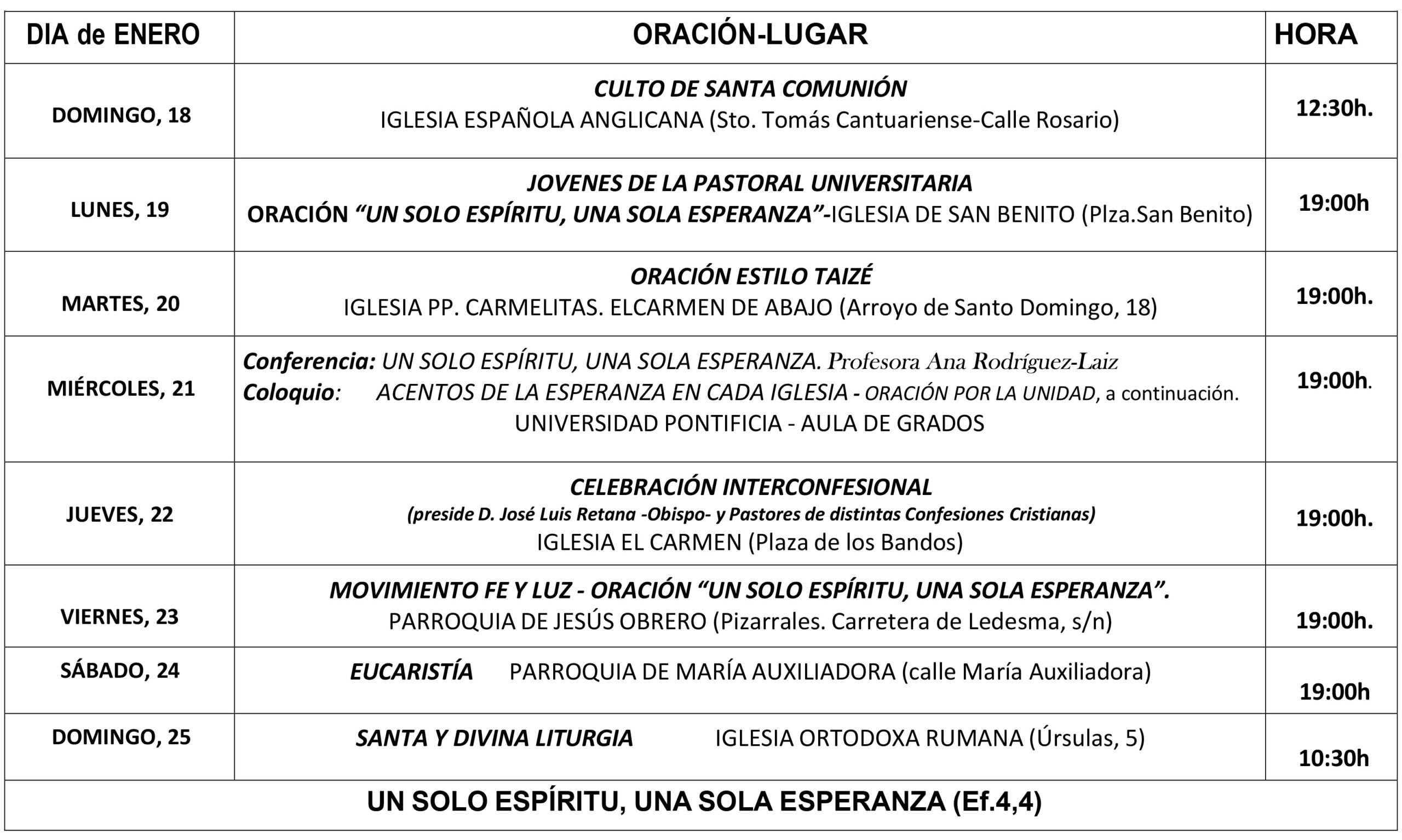 Como suele ser habitual, habrá espacio también para la formación con una conferencia con el título de esta Semana de Oración, “Un solo Espíritu, una sola esperanza”, desde la perspectiva de la teología bíblica, a cargo de la teóloga Ana Rodríguez-Laiz, seguida del coloquio: “Acentos de la esperanza en cada Iglesia”, que tendrán lugar el 21 de enero, a las 19:00 horas en el Aula de Grados de la Universidad Pontificia de Salamanca. Al finalizar, compartirán una oración por la unidad de los cristianos.