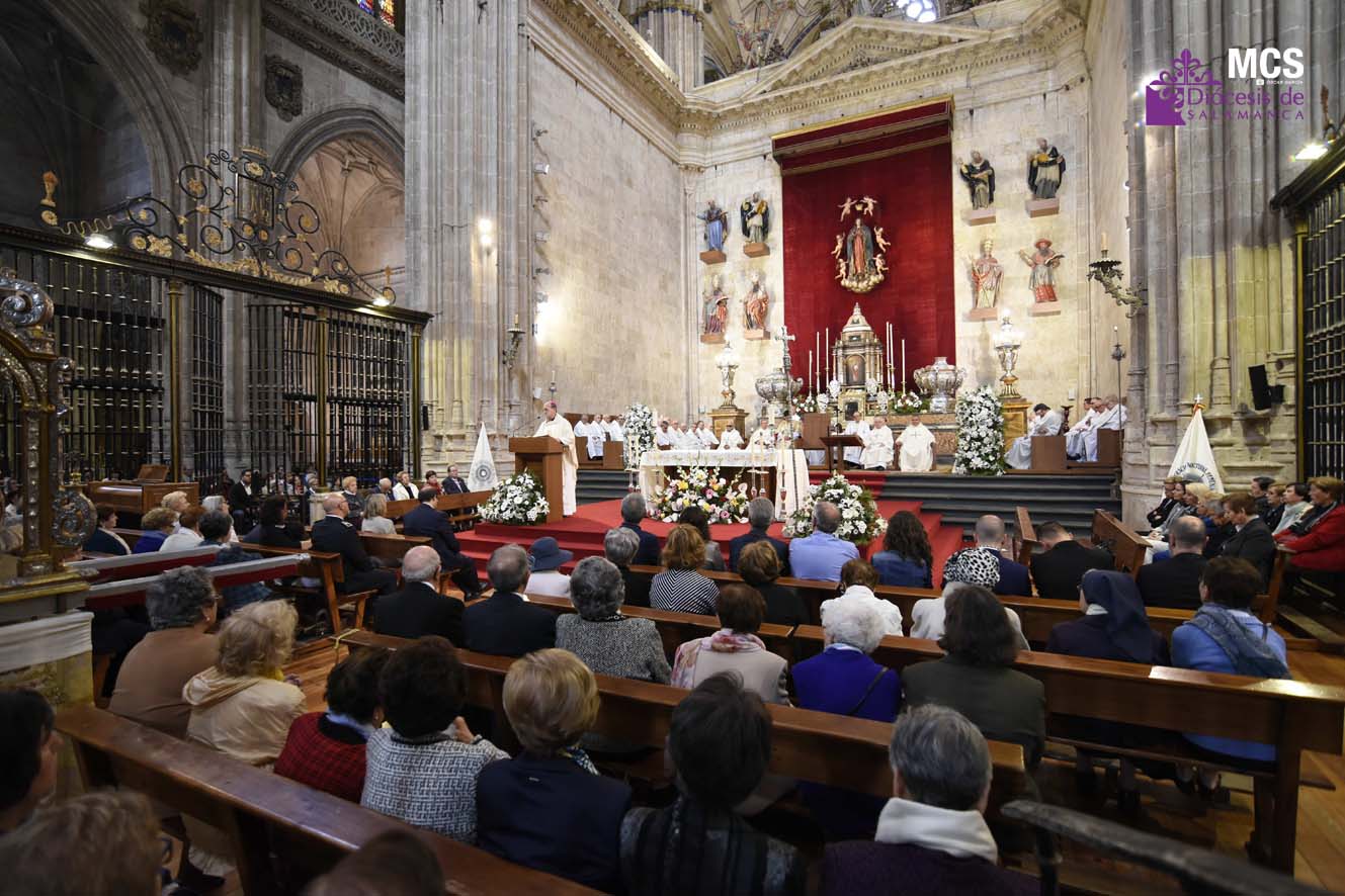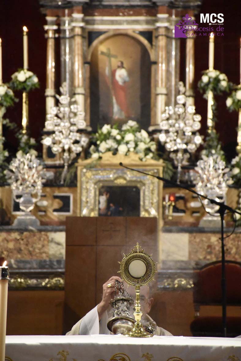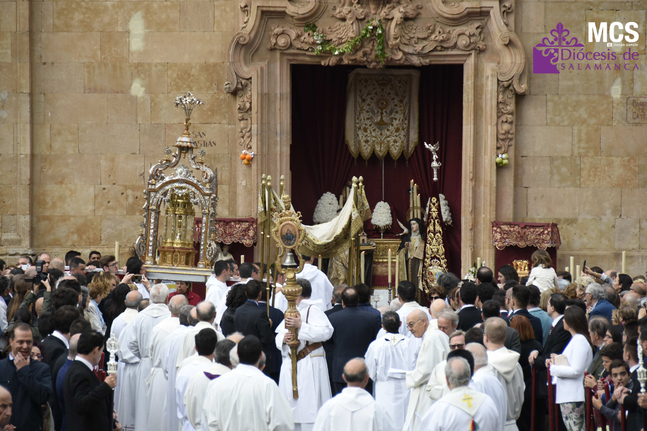 Una vez finalizada la misa, se iniciará la procesión con la custodia, con salida del templo por la Puerta del Obispo, y su habitual recorrido por la calle Calderón de la Barca, Libreros, plaza de San Isidro, Compañía, Meléndez, plaza del Corrillo, Rúa y plaza de Anaya, para realizar la bendición final desde el atrio de la Catedral Nueva. A lo largo de la procesión se instalarán un total de tres altares, con los santos que han celebrado el cuarto centenario de su canonización.