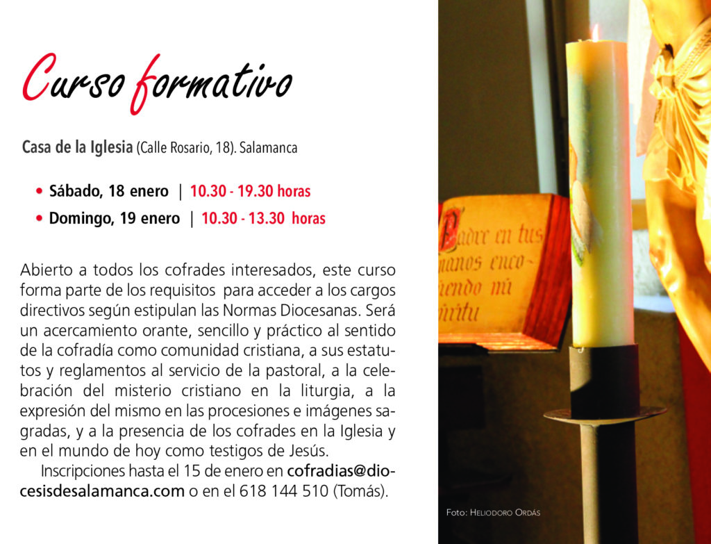 Los próximos días 18 y 19 de enero se celebrará en la Casa de la Iglesia el curso formativo cofrade, organizado por la Coordinadora diocesana de Hermandades y Cofradías de la Diócesis de Salamanca. Cabe recordar que está abierto a todos los cofrades y que forma parte de los requisitos para acceder a los cargos directivos, según se establece en la nueva normativa diocesana de las cofradías.