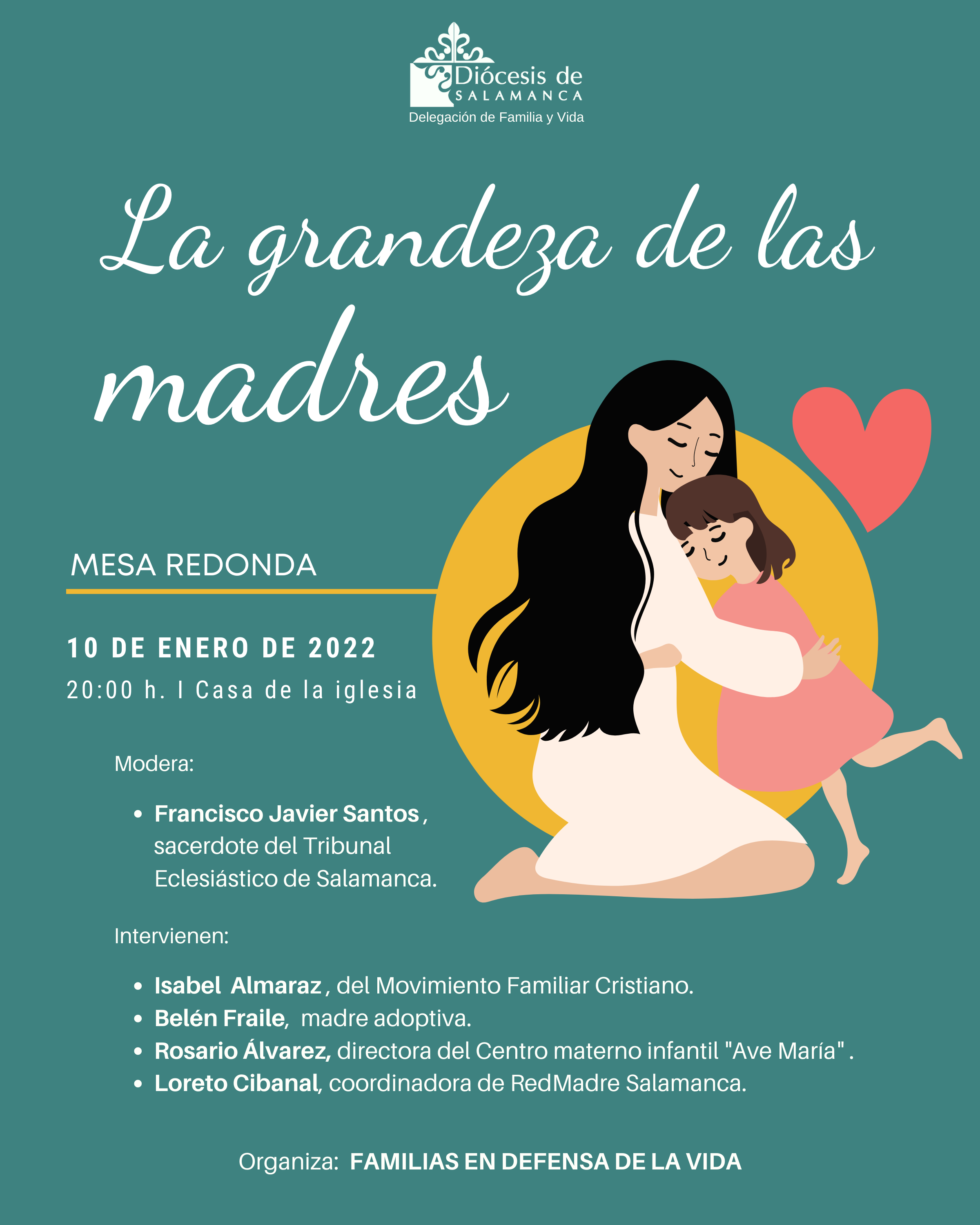 La Delegación diocesana de Familia y Vida retoma sus actividades tras la Navidad, con una mesa redonda organizada por el grupo “Familias en defensa de la vida” y, bajo el título: “La grandeza de las madres”. El acto tendrá lugar el lunes, 10 de enero, a las 20:00 horas en la Casa de la Iglesia, y en él van a intervenir cuatro mujeres que ofrecerán su testimonio y experiencias, poniendo en valor la belleza de la maternidad y la defensa de la vida.