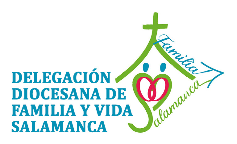 En torno a la idea de FAMILIA, ésta queda representada en la forma de una casa a través de su tejado, bajo el cual se cobijan los hogares cristianos (2Cor 7,16), IGLESIAS DOMÉSTICAS (LG 11) que se identifican por la CRUZ (1Pe 2,24) con la que se remata el logo. Casas que tienen como objetivo poder REFLEJAR EL ROSTRO DE JESÚS, (2Cor 3,18), – que se atisba por la barba que inicia la “S” de Salamanca; los ojos con las cabezas de los esposos; y el tejado como el pelo del icono-. Es el Señor quien une a los esposos, representados en el centro a través de DOS ALIANZAS ENTRECRUZADAS (Gen 2,24 y Mt 19,5-6), quienes, por su unión, formarán un nuevo hogar.