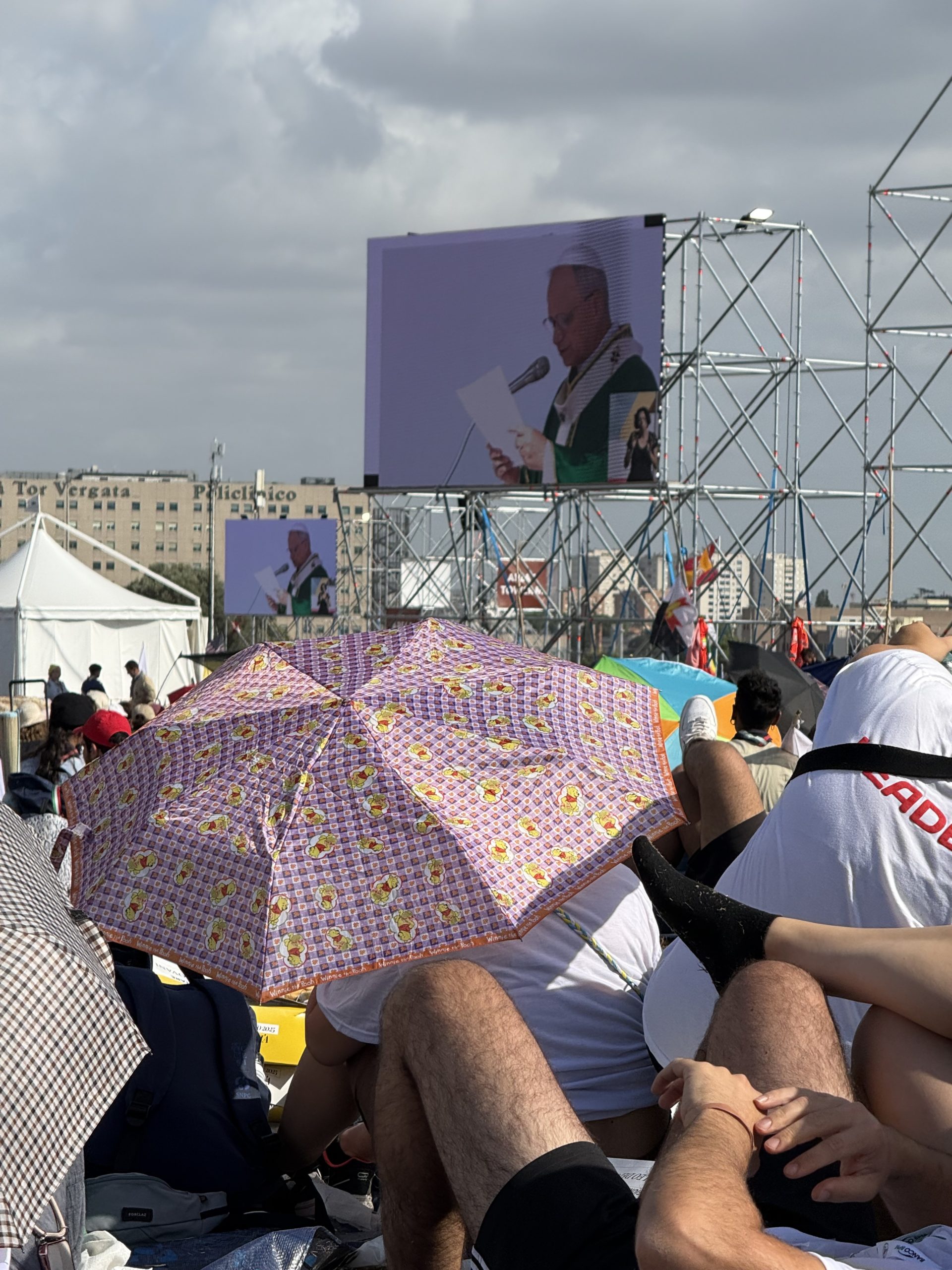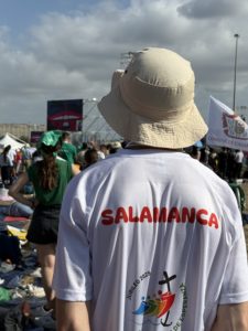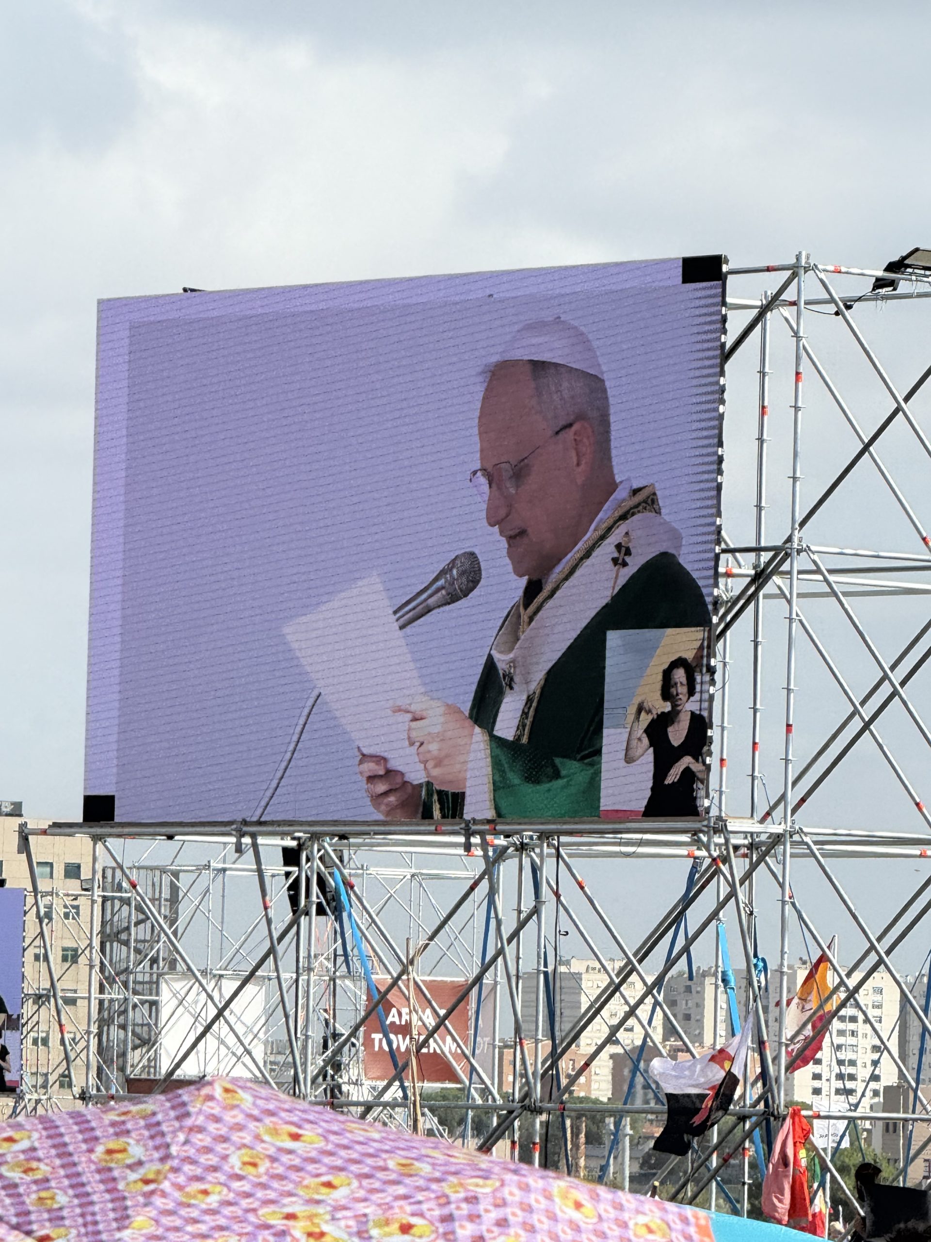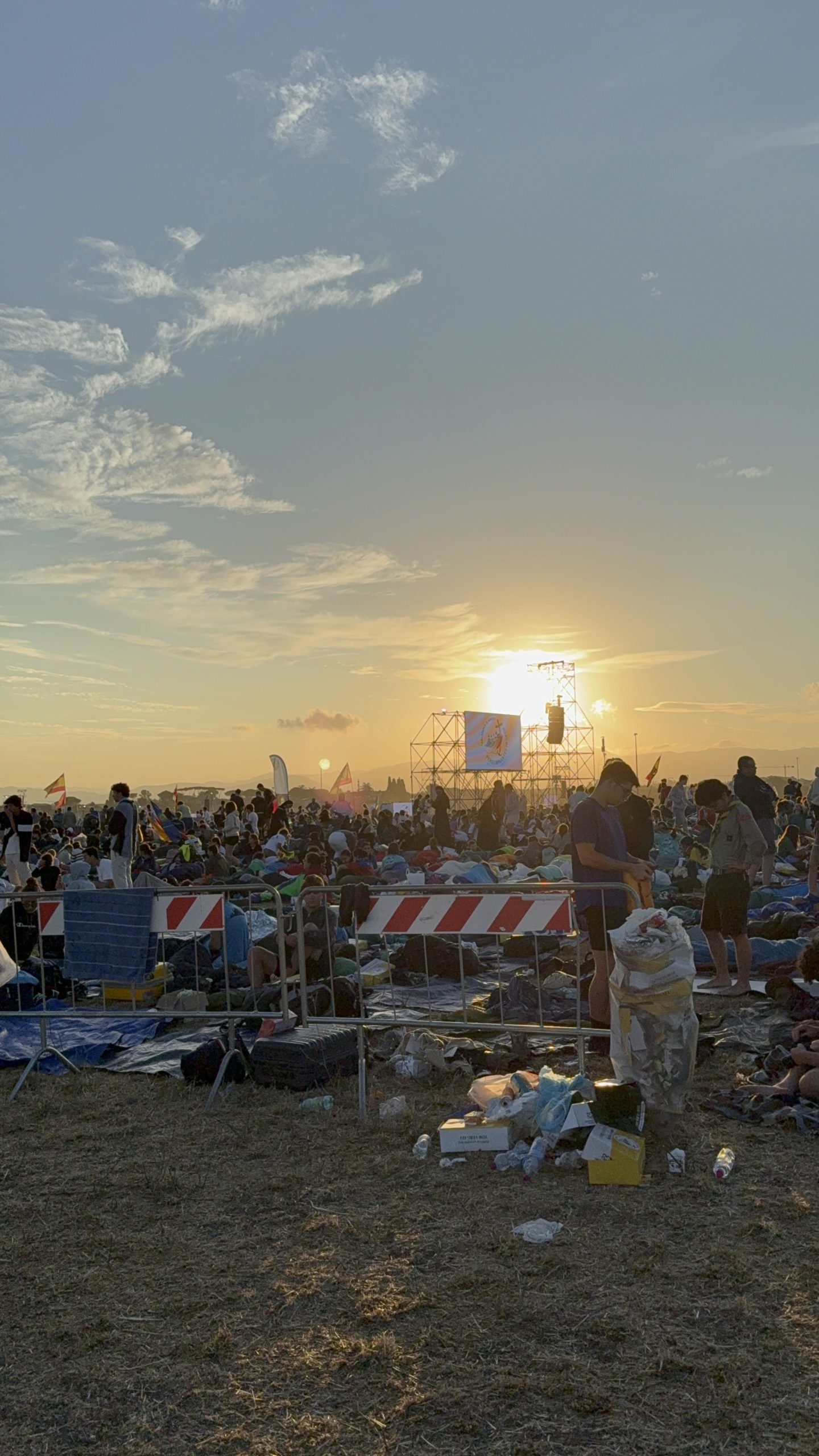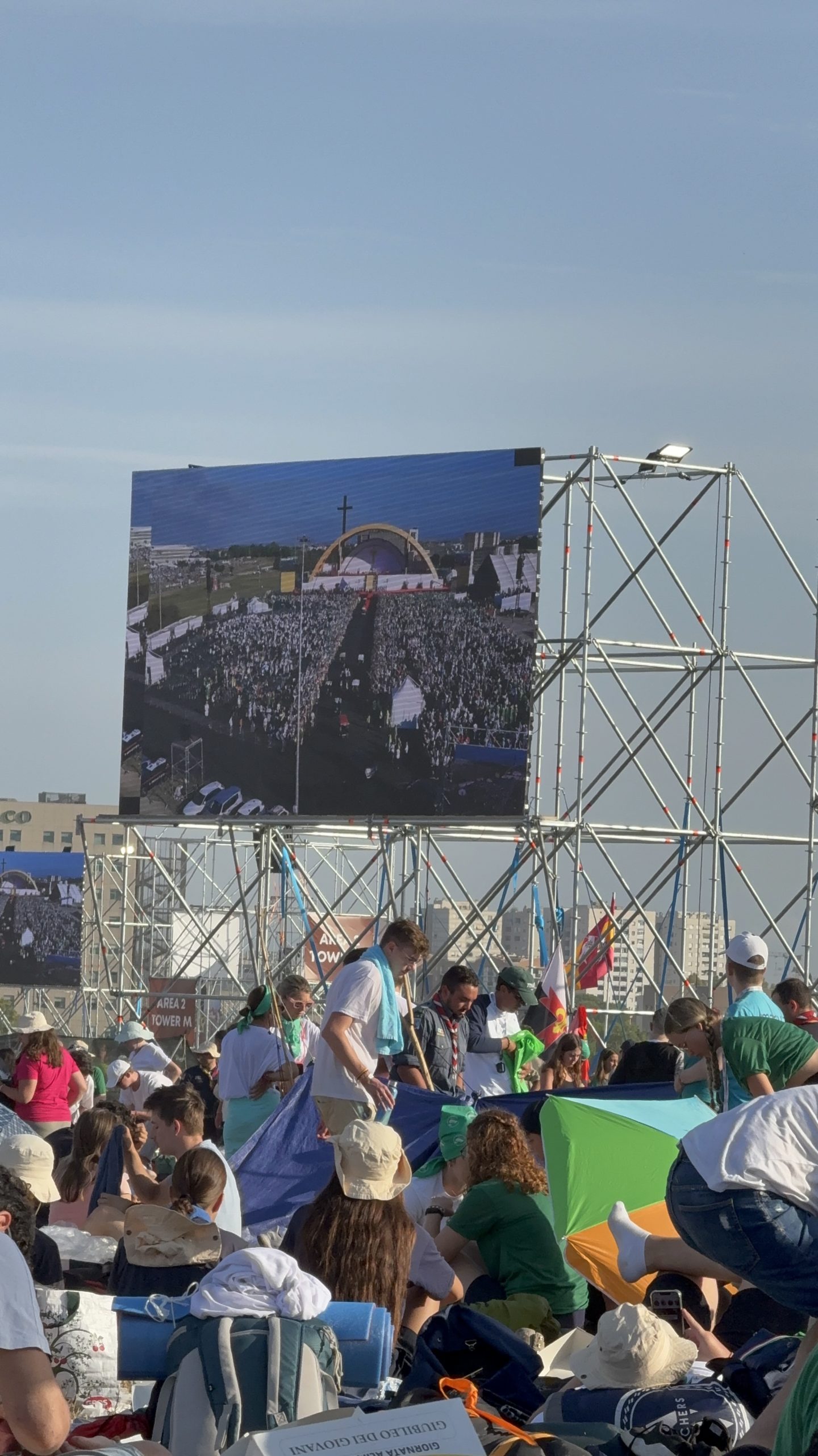 Alrededor de las seis de la mañana, la megafonía comenzó a sonar suavemente para despertar a los peregrinos con música y avisos de la organización. Sobre las ocho, el helicóptero del papa sobrevolaba la explanada, generando un silencio reverente que pronto se convirtió en ovación al verlo pasar en su papamóvil por una de las vías cercanas al sector donde descansaban los jóvenes de Salamanca. Fue un instante fugaz pero profundamente significativo.