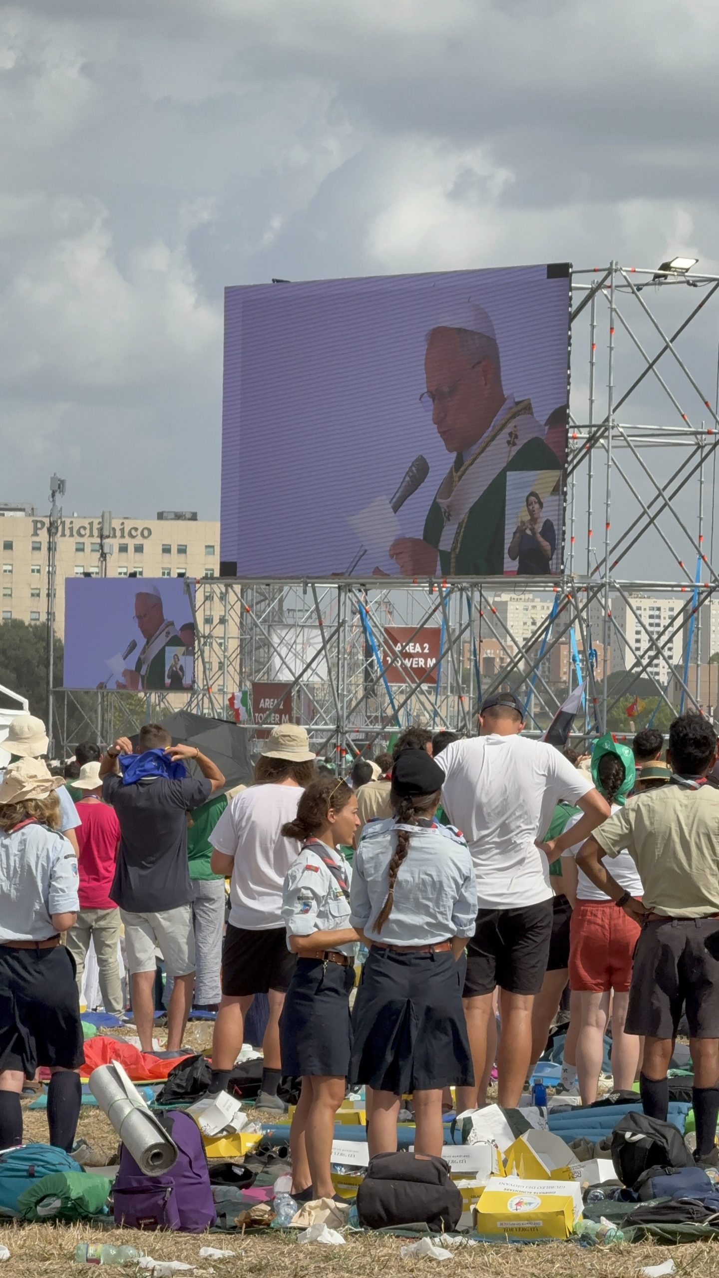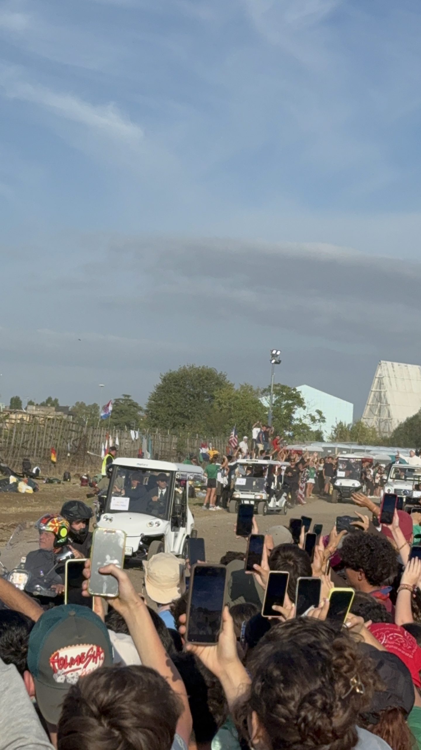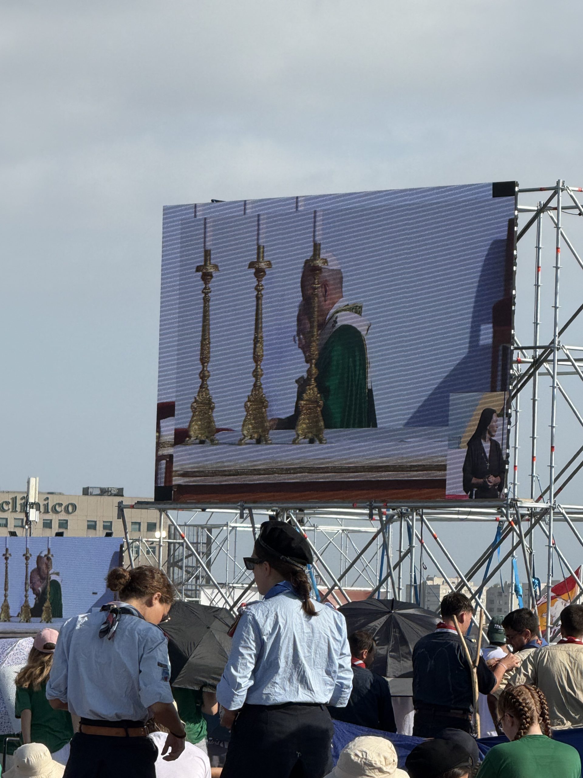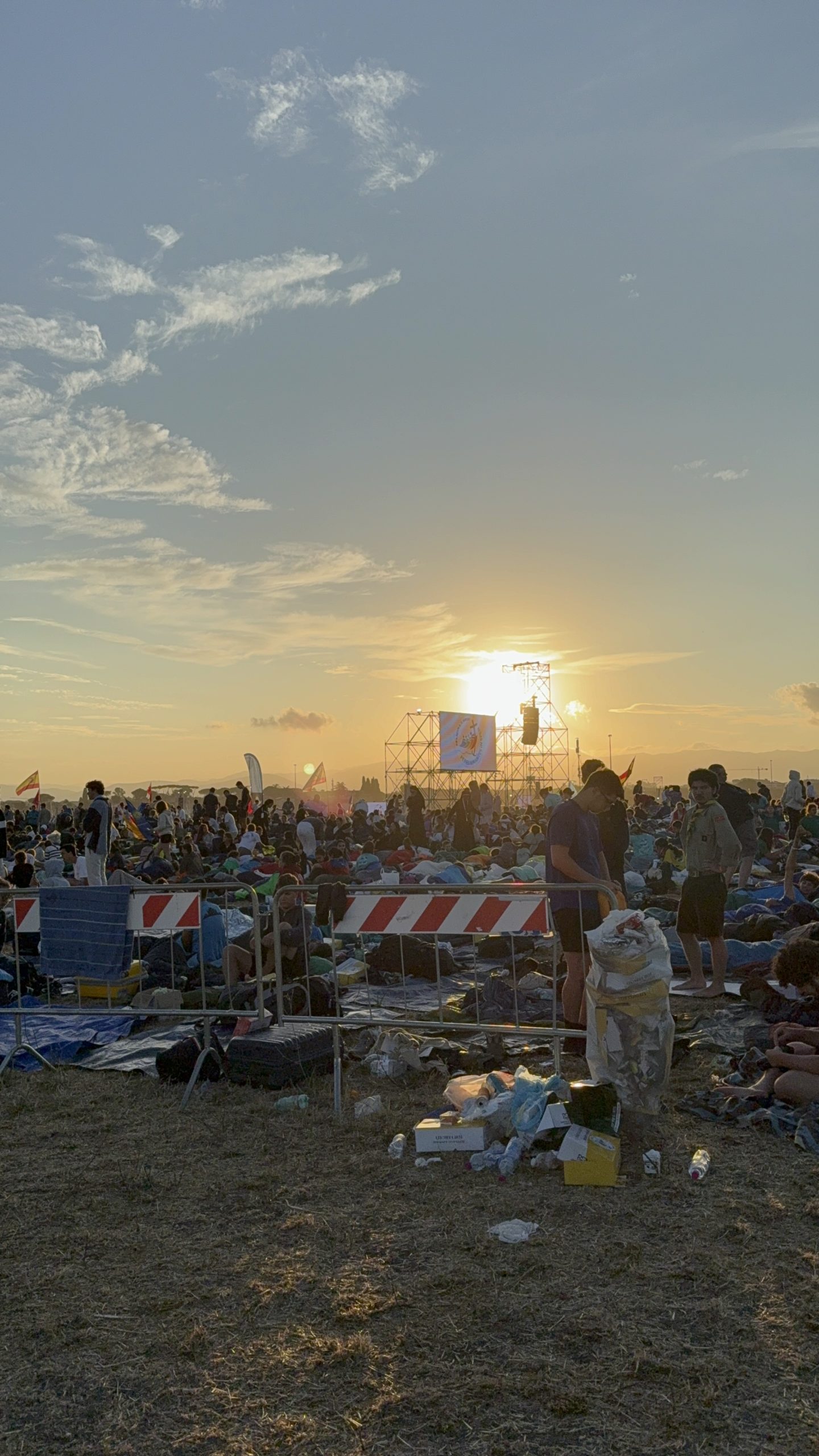 Alrededor de las seis de la mañana, la megafonía comenzó a sonar suavemente para despertar a los peregrinos con música y avisos de la organización. Sobre las ocho, el helicóptero del papa sobrevolaba la explanada, generando un silencio reverente que pronto se convirtió en ovación al verlo pasar en su papamóvil por una de las vías cercanas al sector donde descansaban los jóvenes de Salamanca. Fue un instante fugaz pero profundamente significativo.