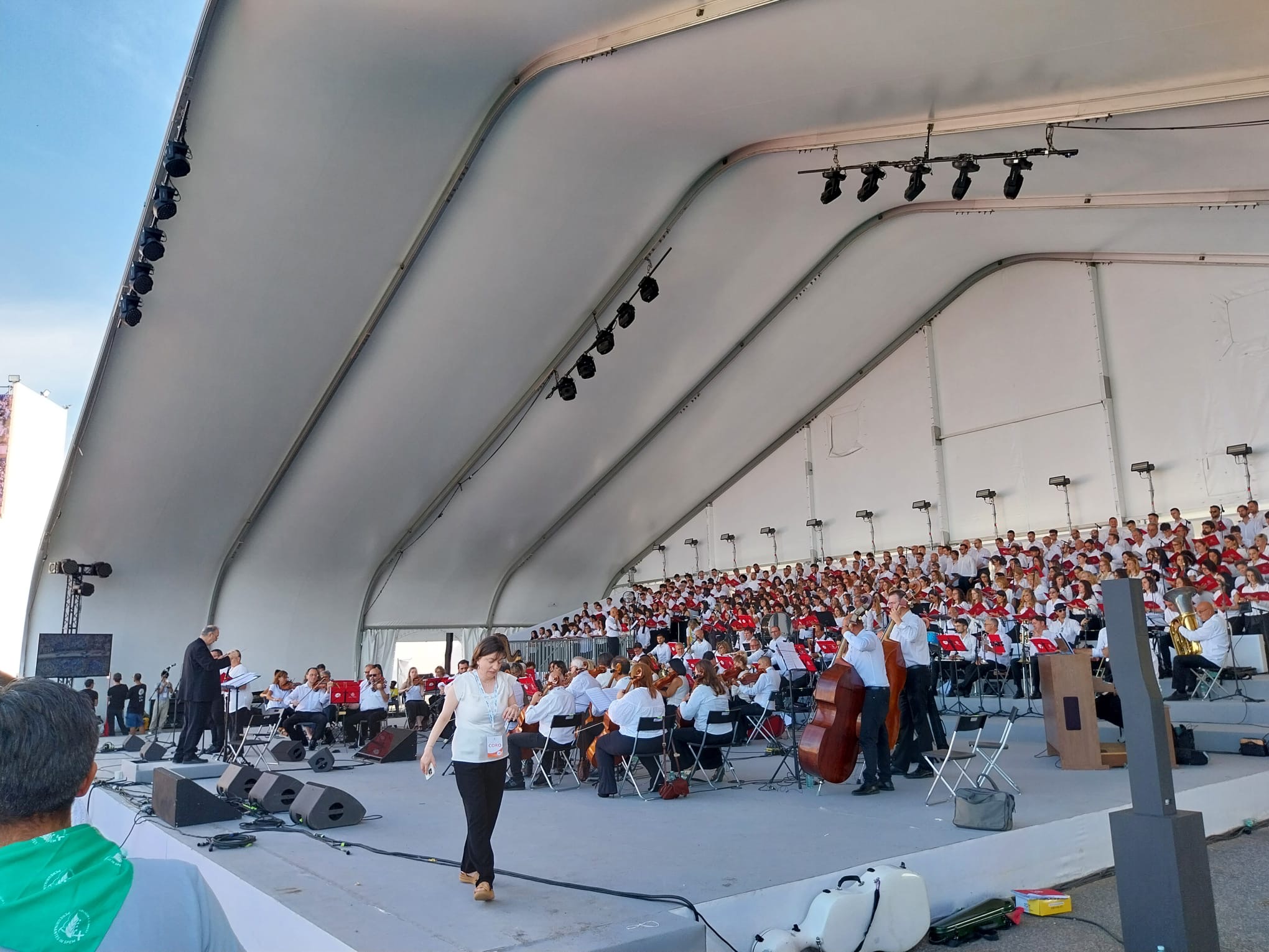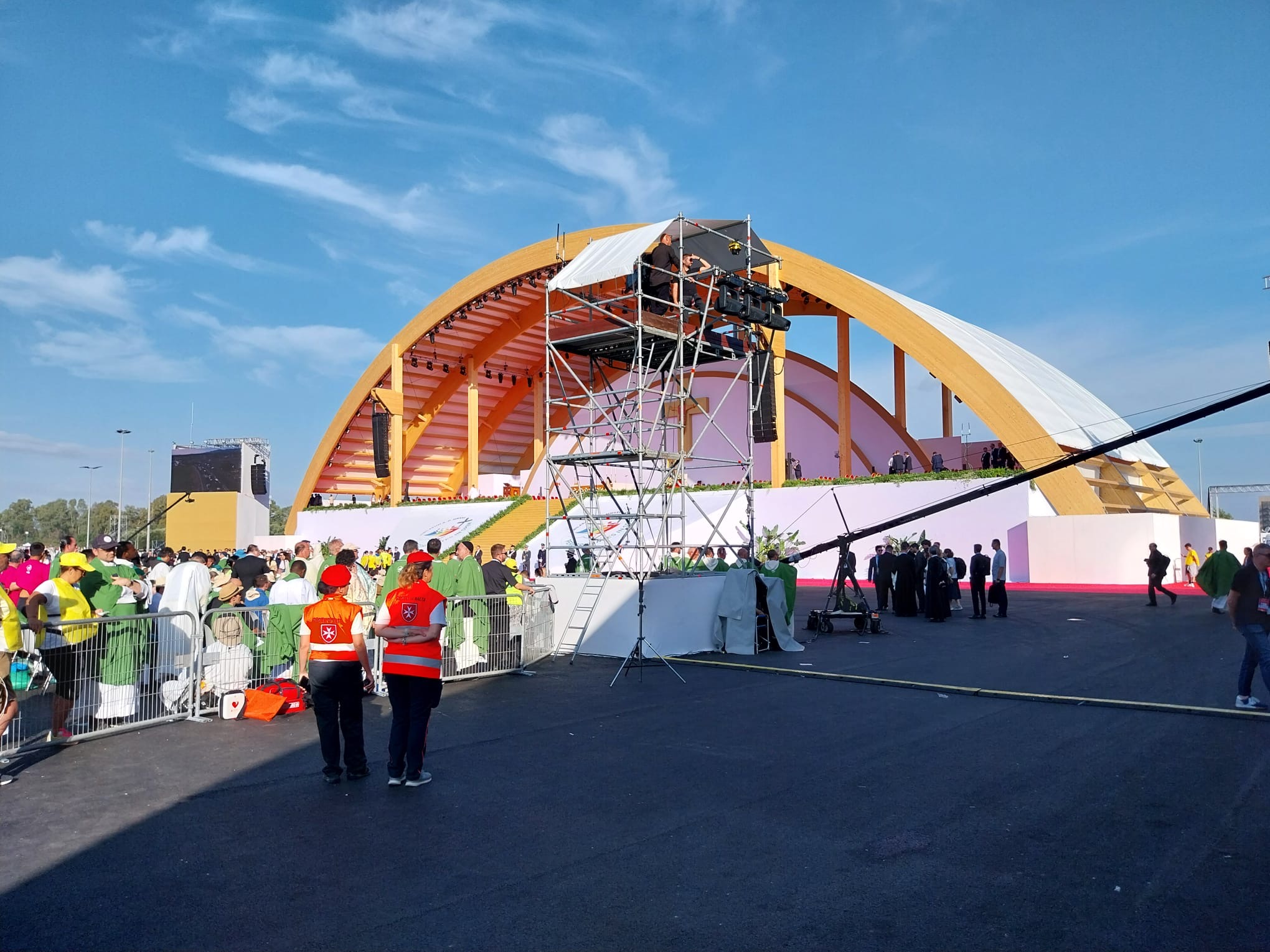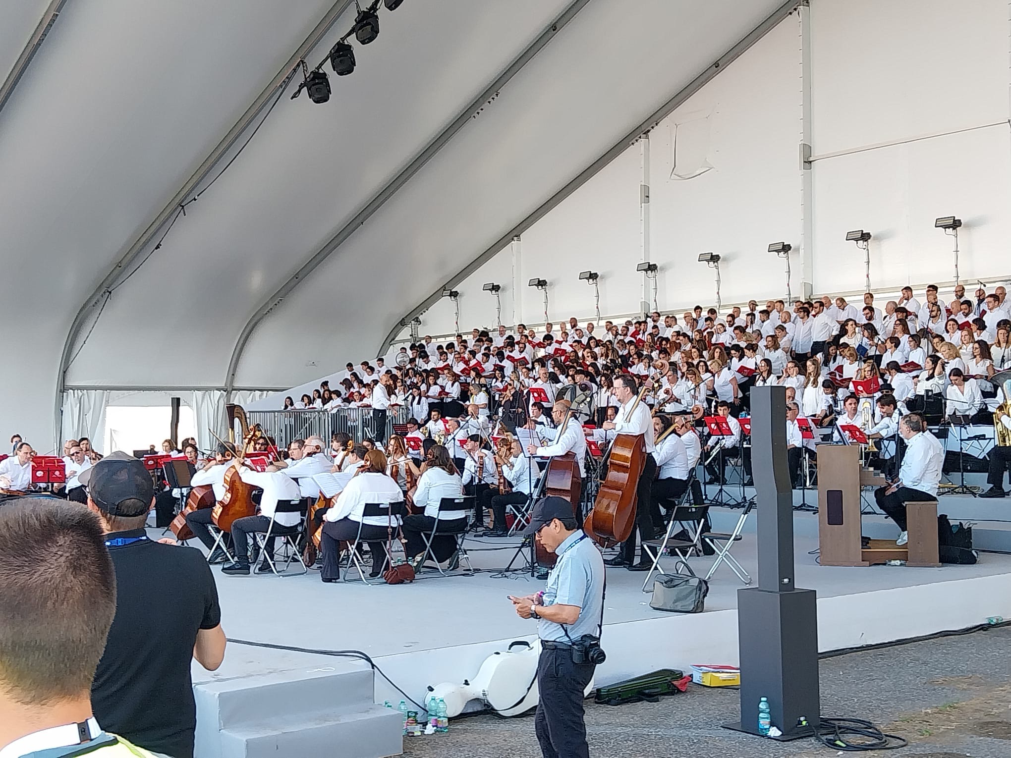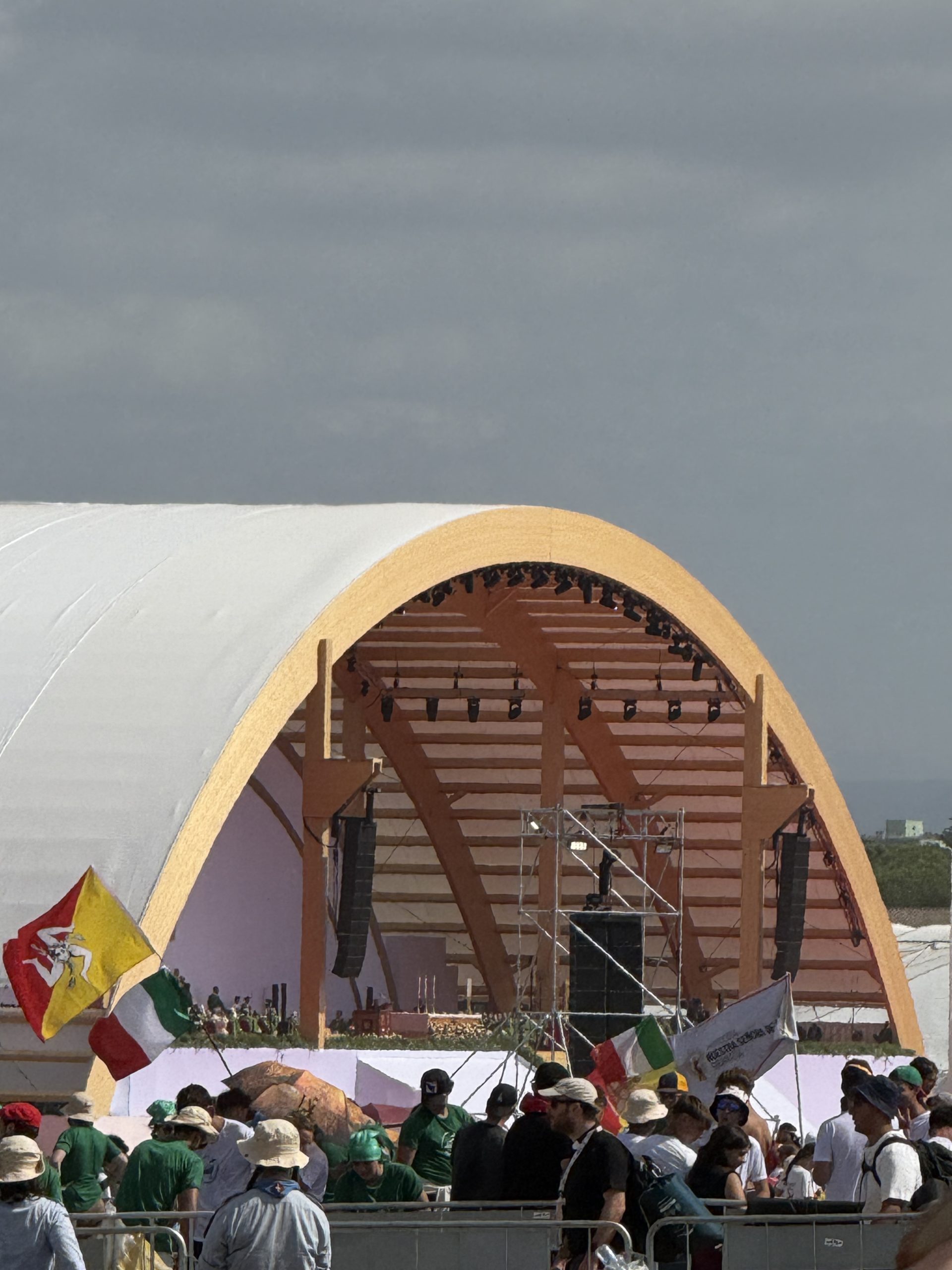 Alrededor de las seis de la mañana, la megafonía comenzó a sonar suavemente para despertar a los peregrinos con música y avisos de la organización. Sobre las ocho, el helicóptero del papa sobrevolaba la explanada, generando un silencio reverente que pronto se convirtió en ovación al verlo pasar en su papamóvil por una de las vías cercanas al sector donde descansaban los jóvenes de Salamanca. Fue un instante fugaz pero profundamente significativo.