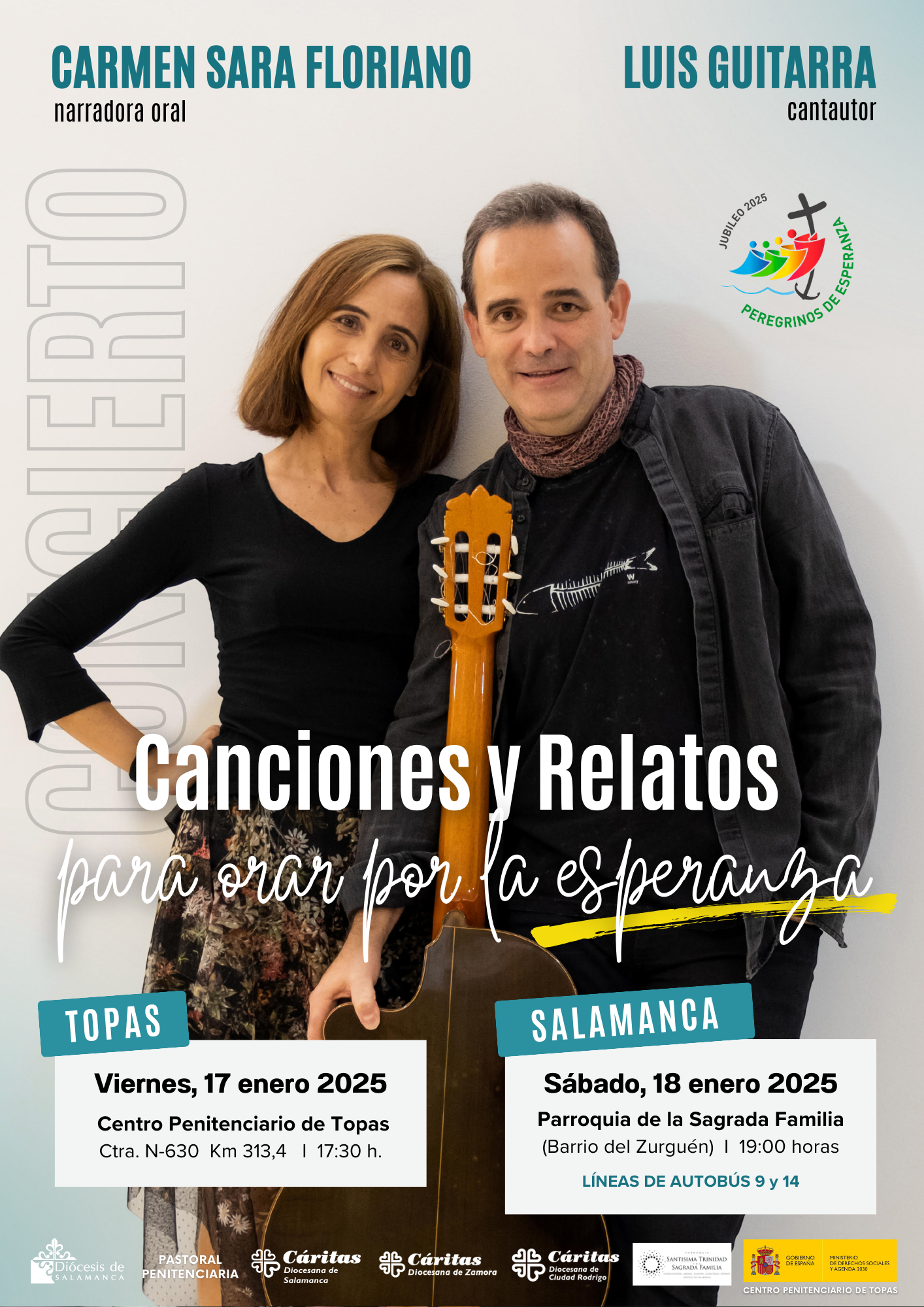 Este fin de semana, abrirán el programa cultural del Jubileo 2025 en Salamanca, con dos actuaciones bajo el título “Canciones y relatos para orar por la esperanza”. La primera será el viernes, 17 de enero, a las 17:30 horas en el Centro Penitenciario de Topas, y la segunda, el sábado 18, a las 19:00 horas en la iglesia de la Sagrada Familia del Barrio del Zurguén.
