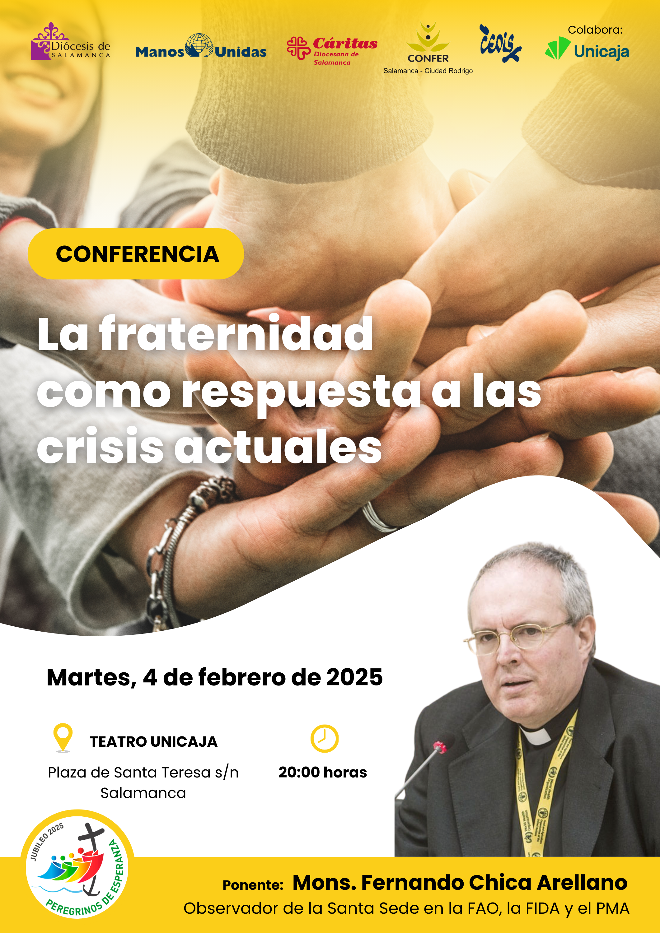 Esta conferencia forma parte del programa diseñado por la Comisión diocesana para el Jubileo 2025 y ha sido organizada en colaboración con Cáritas diocesana, Manos Unidas, Confer Salamanca-Ciudad Rodrigo, Cedis y Unicaja.