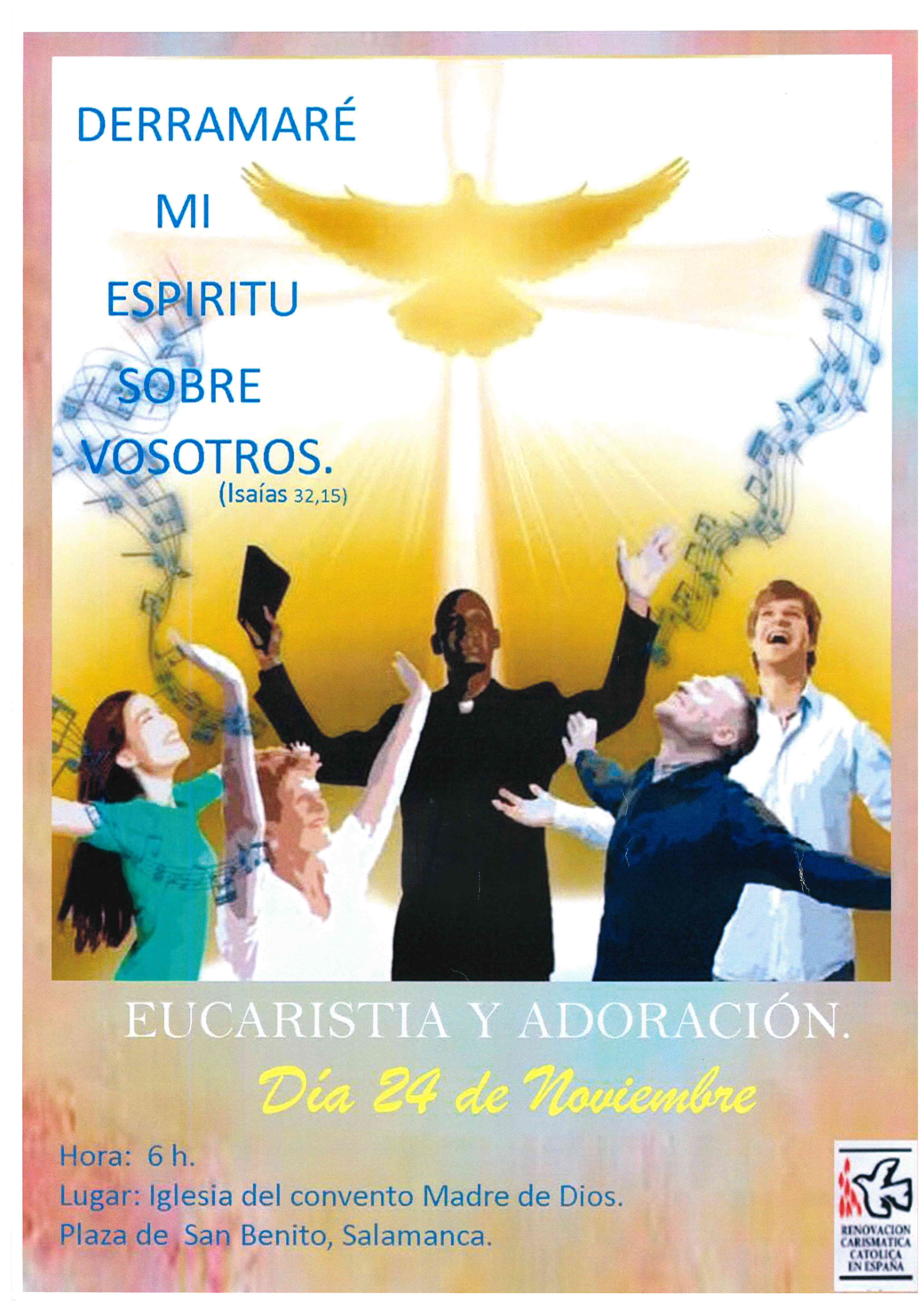 El movimiento Renovación Carismática Católica de Salamanca invita a participar en su encuentro mensual de Eucaristía y Adoración. Tendrá lugar el sábado 24 de noviembre, a las 18.00 horas en la iglesia del convento Madre de Dios, en la Plaza de San Benito de Salamanca.