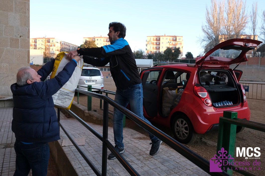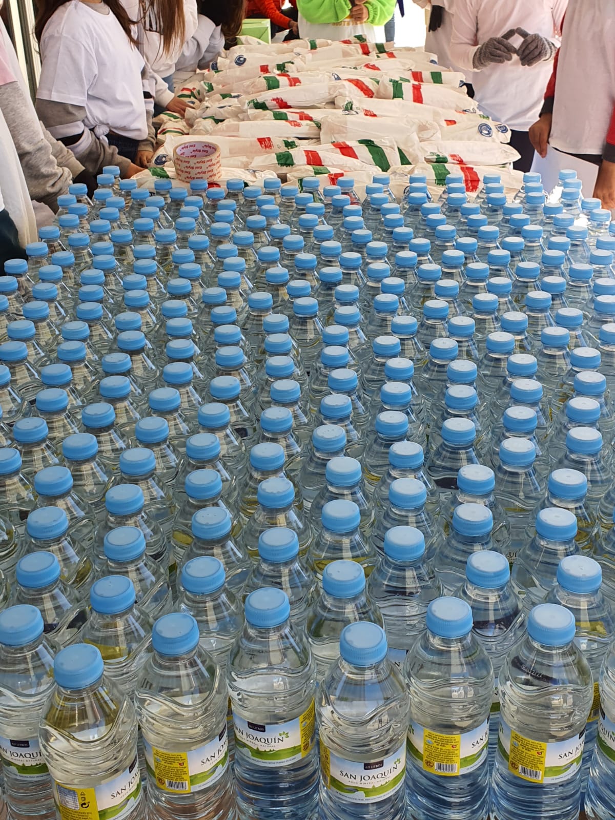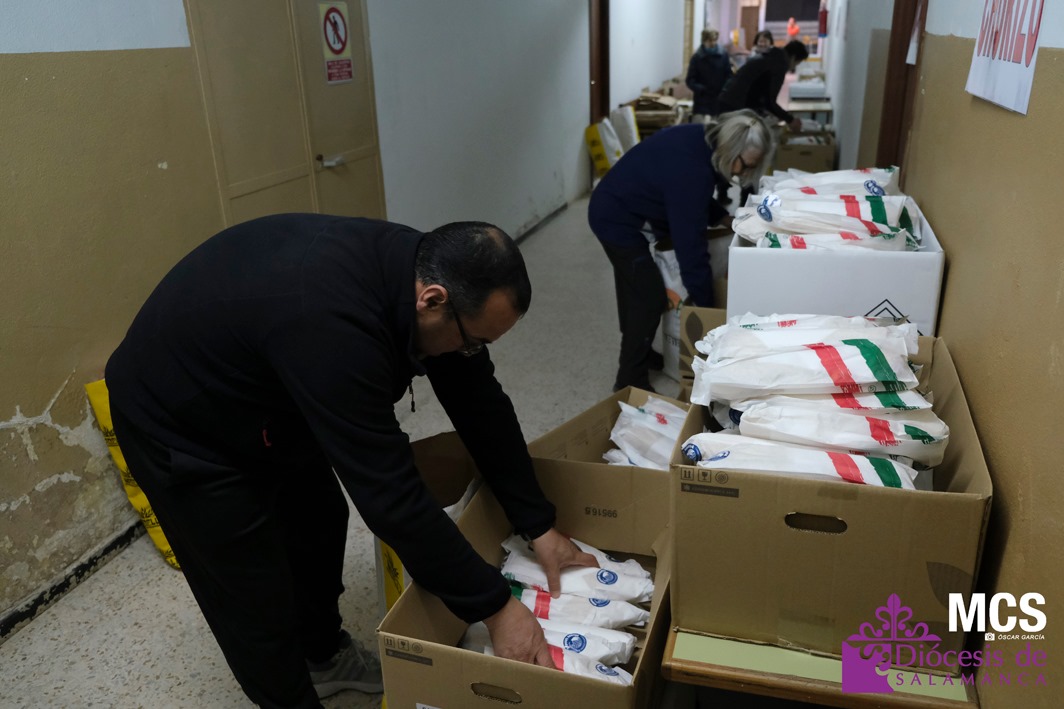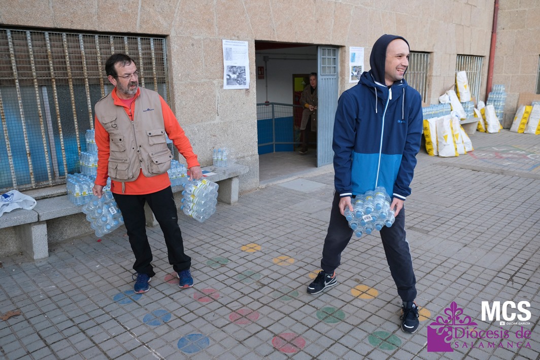 No todos los voluntarios estaban en la tarea de elaborar los bocadillos, otros tenían como función repartir a diferentes puntos, aunque no todos, alunos pedían lo recogía en los Trinitarios, centro de operaciones de esta campaña de Manos Unidas. Antes de llegar a las furgonetas de reparto, los bocadillos se distribuyen en sacos de 50 según su ingrediente. Los más demandados son el queso y el salchichón, y el tercer puesto, para el chorizo. Sobre una de las ventanas está pegado el listado de peticiones de bocadillos, más de 18.000 unidades. En la zona de reparto contaban con seis furgonetas y 25 personas, que en ocasiones hacían cadena para cargar el agua (18.000 botellines de 0,5 litros).