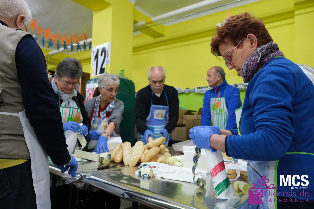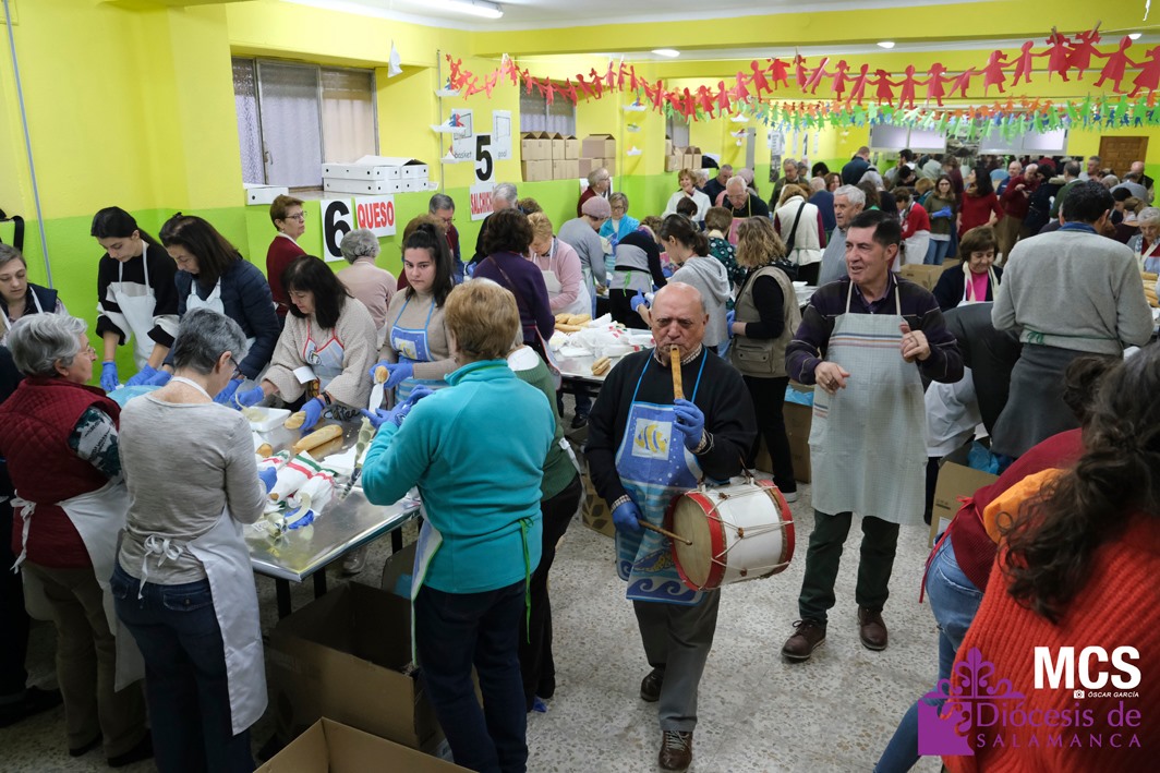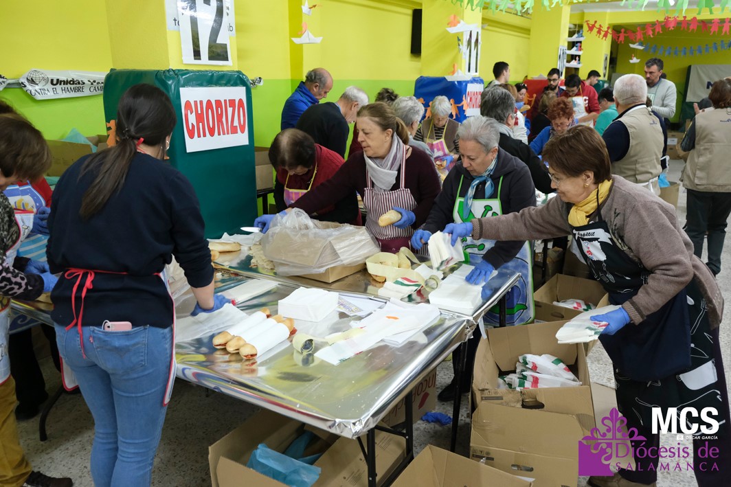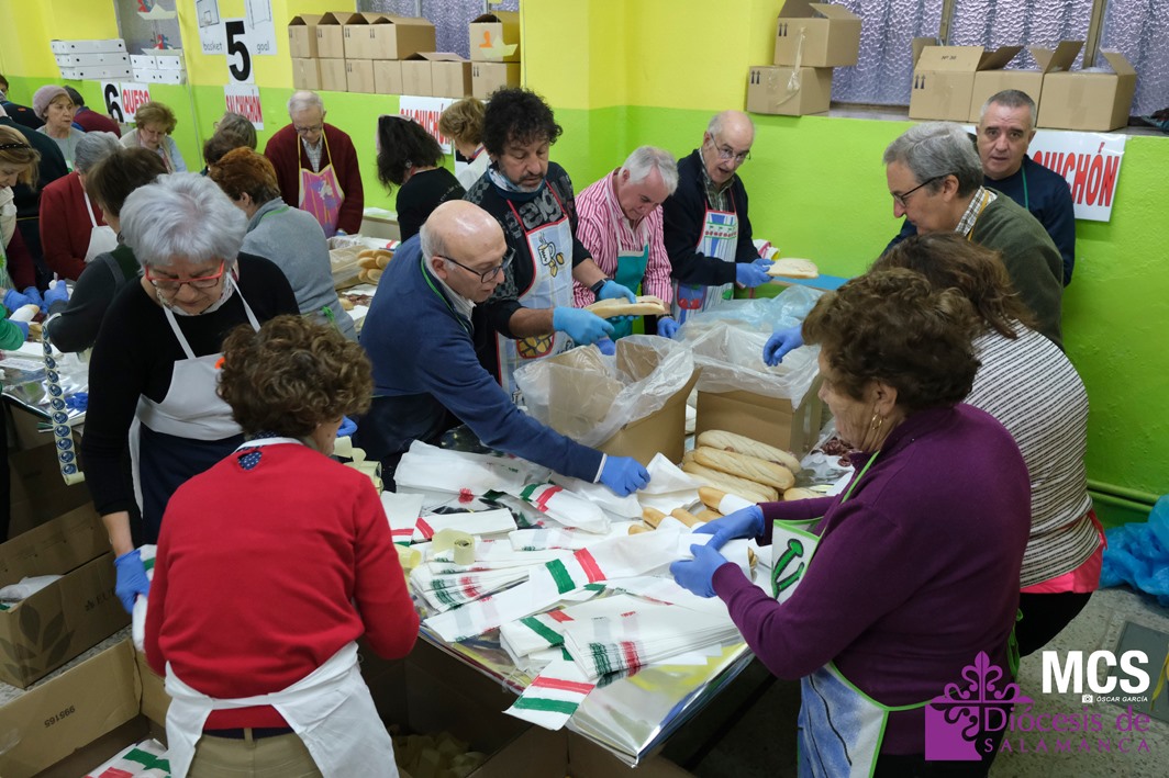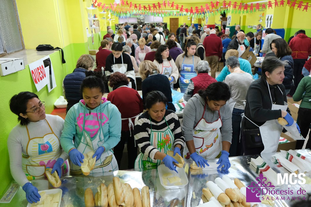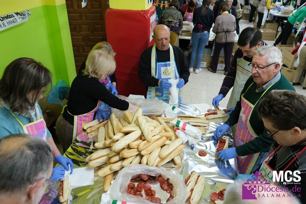 Porque los bocadillos solidarios de Manos Unidas, a 3,50 euros, han llegado a puntos tan dispares como El Cubo de Don Sancho, San Miguel de Valero o Gomecello, entre otros. El consiliario de Manos Unidas, el sacerdote diocesano Fructuoso Mangas, contó a cada uno de voluntarios a primera hora de la mañana: “Son 160, 90 mujeres y 70 hombres“. De toda las edades y condiciones laborales, como jubilados, estudiantes universitarios…a los que durante unas horas les unía la tarea de completar bocadillos. Los grupos estaban distribuidos en mesas de ocho o nueve personas, trabajando en cadena. Unas rellenaban el pan de fiambre, otros lo envolvían en la servilleta para meterlo a la bolsa de papel, y por último, cerrar la misma con la pegatina de Manos Unidas.