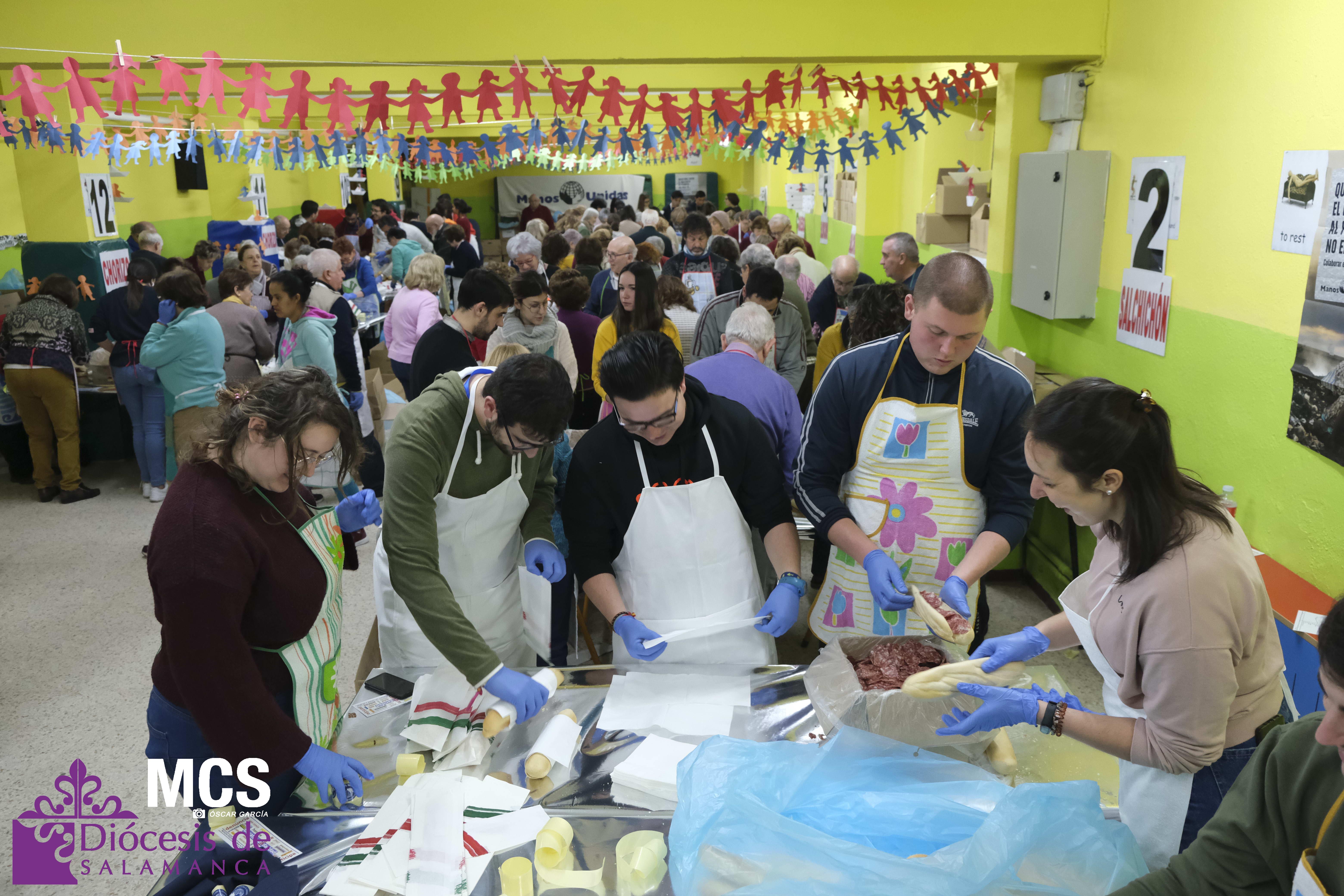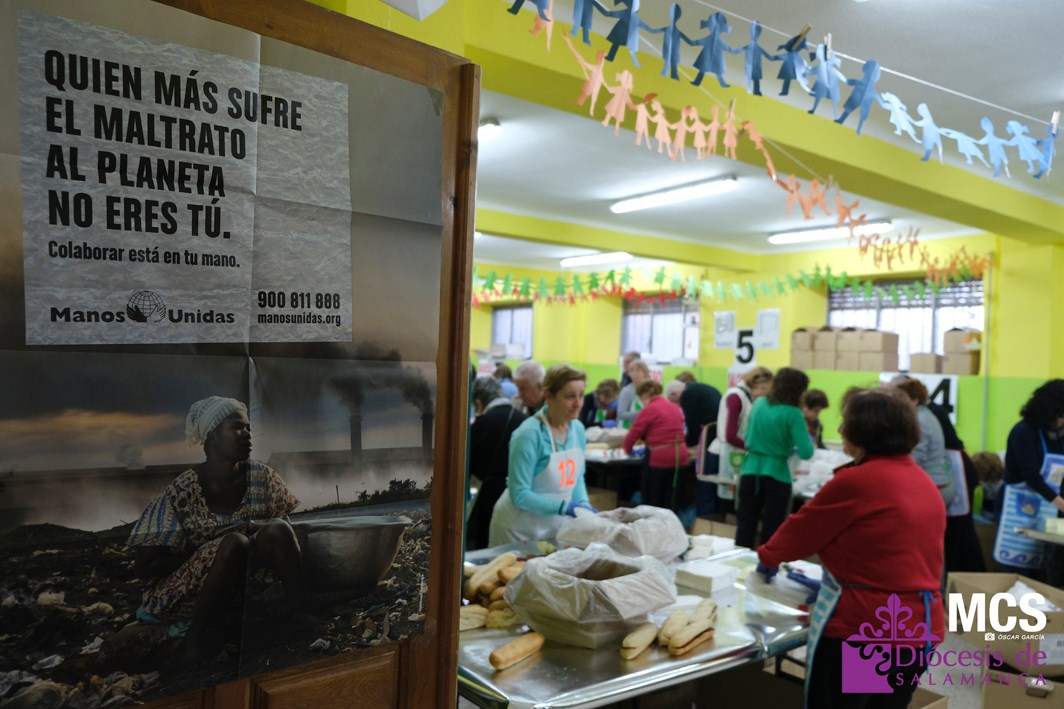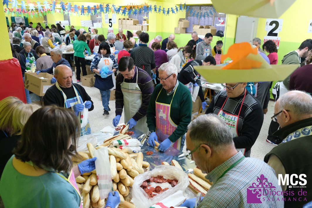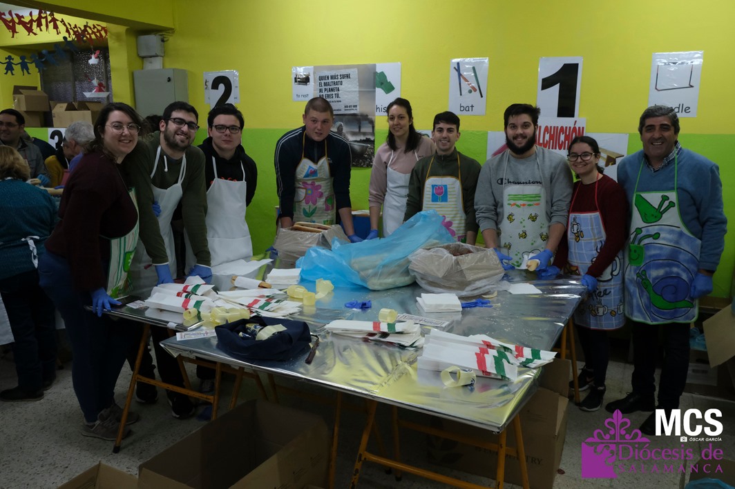 Porque los bocadillos solidarios de Manos Unidas, a 3,50 euros, han llegado a puntos tan dispares como El Cubo de Don Sancho, San Miguel de Valero o Gomecello, entre otros. El consiliario de Manos Unidas, el sacerdote diocesano Fructuoso Mangas, contó a cada uno de voluntarios a primera hora de la mañana: “Son 160, 90 mujeres y 70 hombres“. De toda las edades y condiciones laborales, como jubilados, estudiantes universitarios…a los que durante unas horas les unía la tarea de completar bocadillos. Los grupos estaban distribuidos en mesas de ocho o nueve personas, trabajando en cadena. Unas rellenaban el pan de fiambre, otros lo envolvían en la servilleta para meterlo a la bolsa de papel, y por último, cerrar la misma con la pegatina de Manos Unidas.