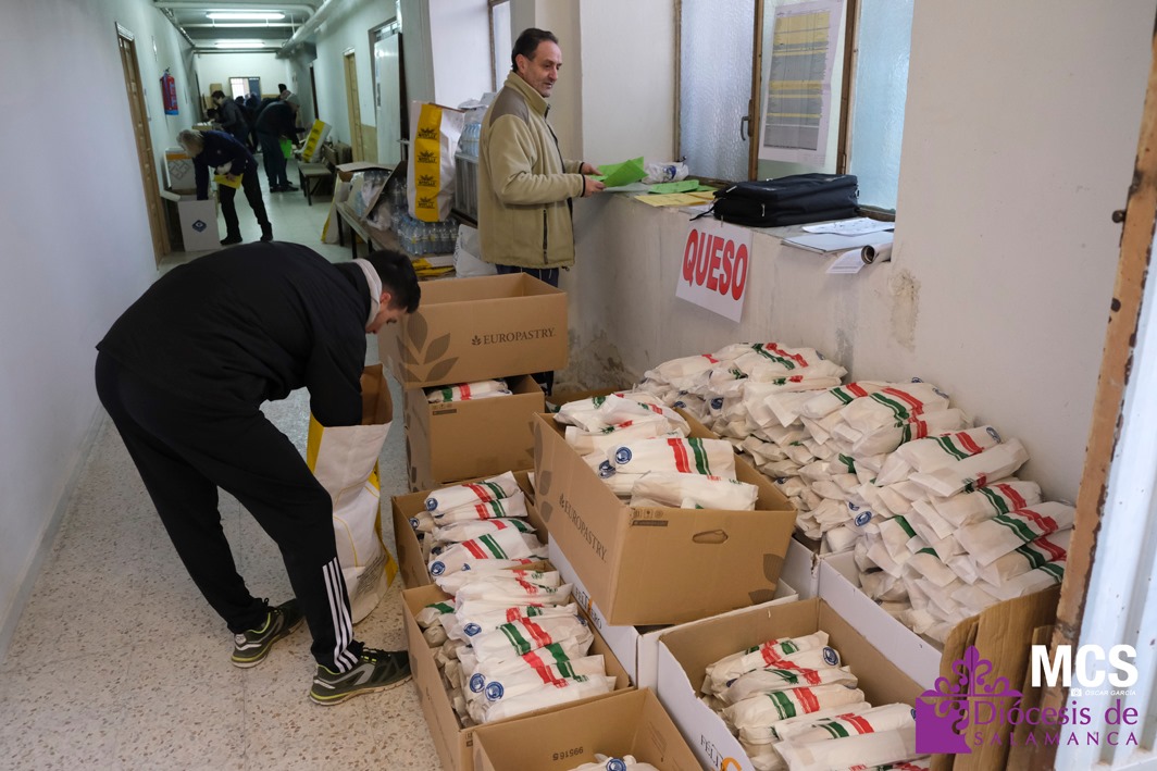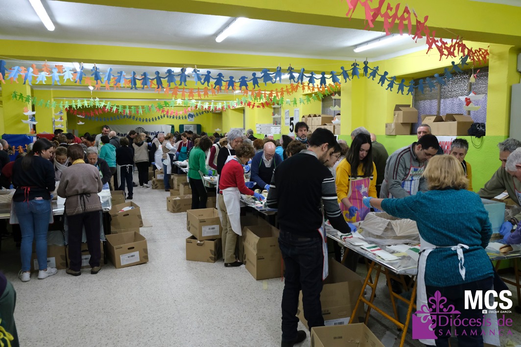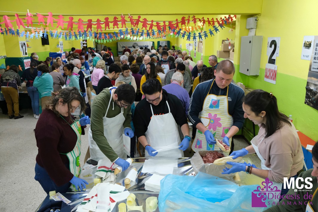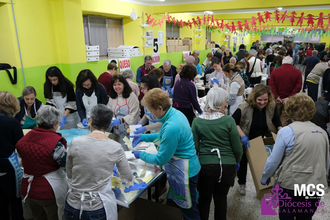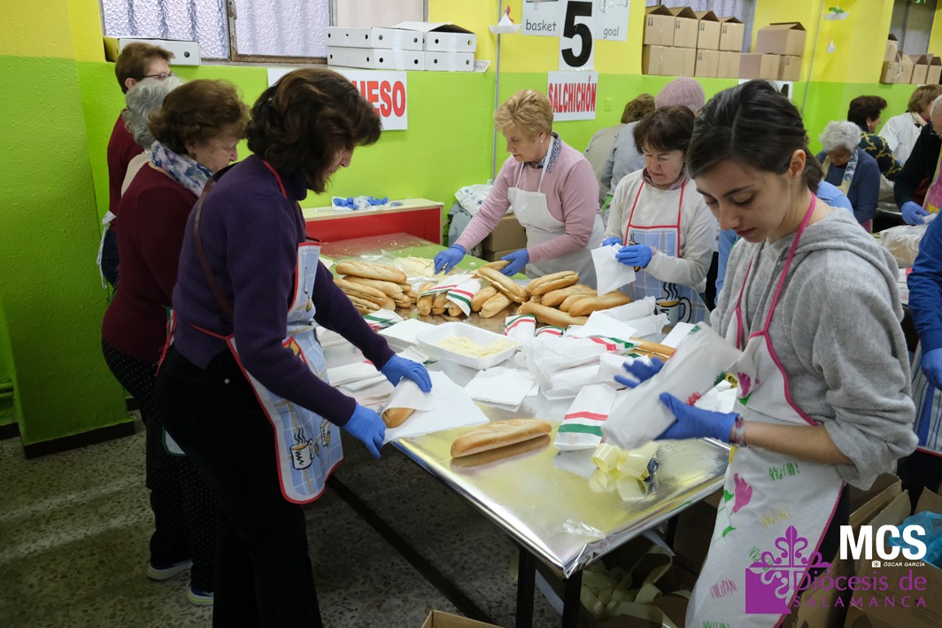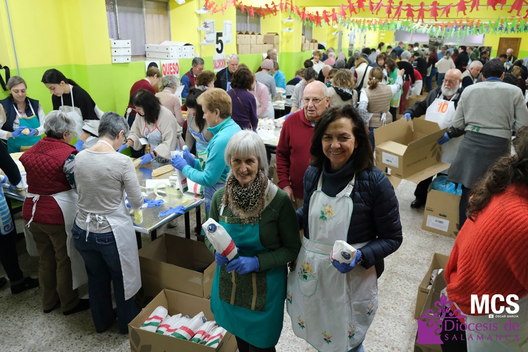 Porque los bocadillos solidarios de Manos Unidas, a 3,50 euros, han llegado a puntos tan dispares como El Cubo de Don Sancho, San Miguel de Valero o Gomecello, entre otros. El consiliario de Manos Unidas, el sacerdote diocesano Fructuoso Mangas, contó a cada uno de voluntarios a primera hora de la mañana: “Son 160, 90 mujeres y 70 hombres“. De toda las edades y condiciones laborales, como jubilados, estudiantes universitarios…a los que durante unas horas les unía la tarea de completar bocadillos. Los grupos estaban distribuidos en mesas de ocho o nueve personas, trabajando en cadena. Unas rellenaban el pan de fiambre, otros lo envolvían en la servilleta para meterlo a la bolsa de papel, y por último, cerrar la misma con la pegatina de Manos Unidas.