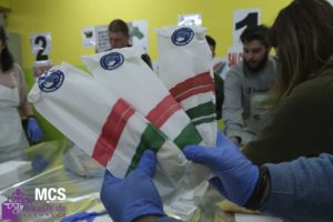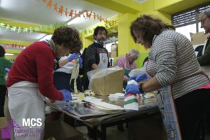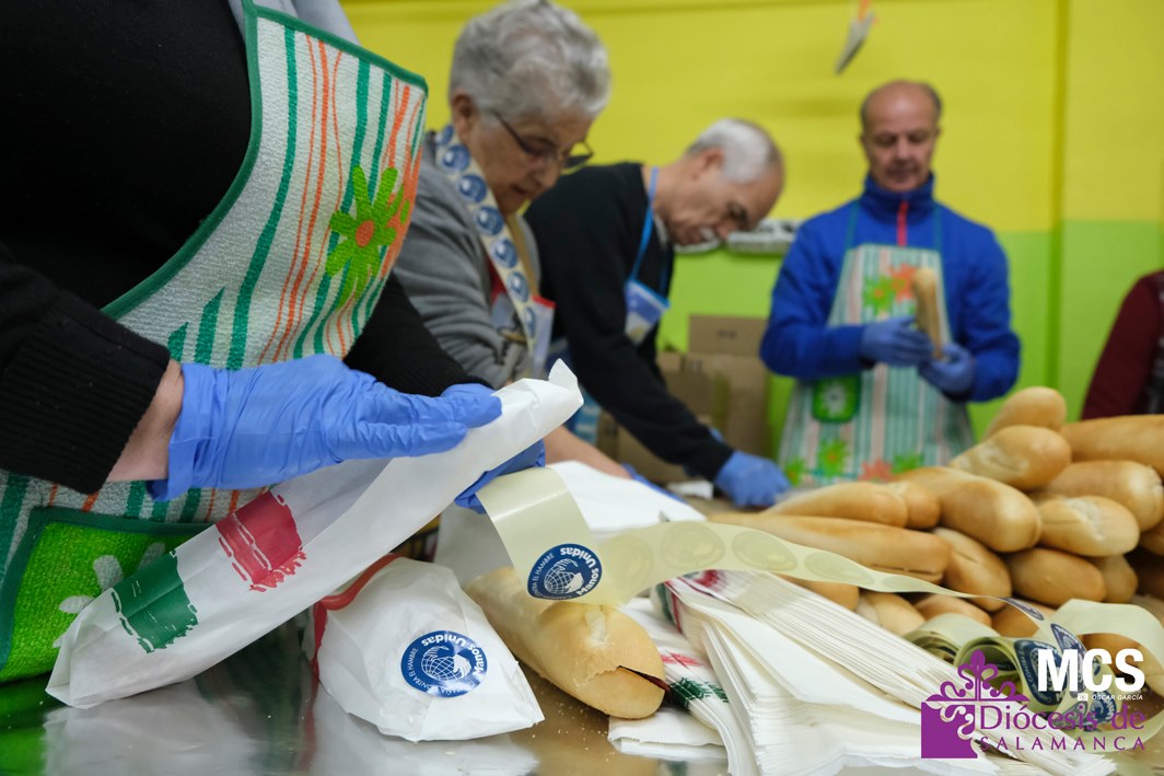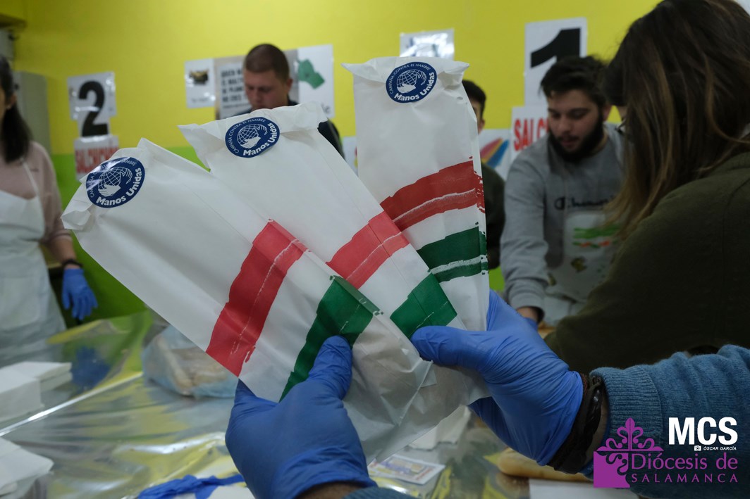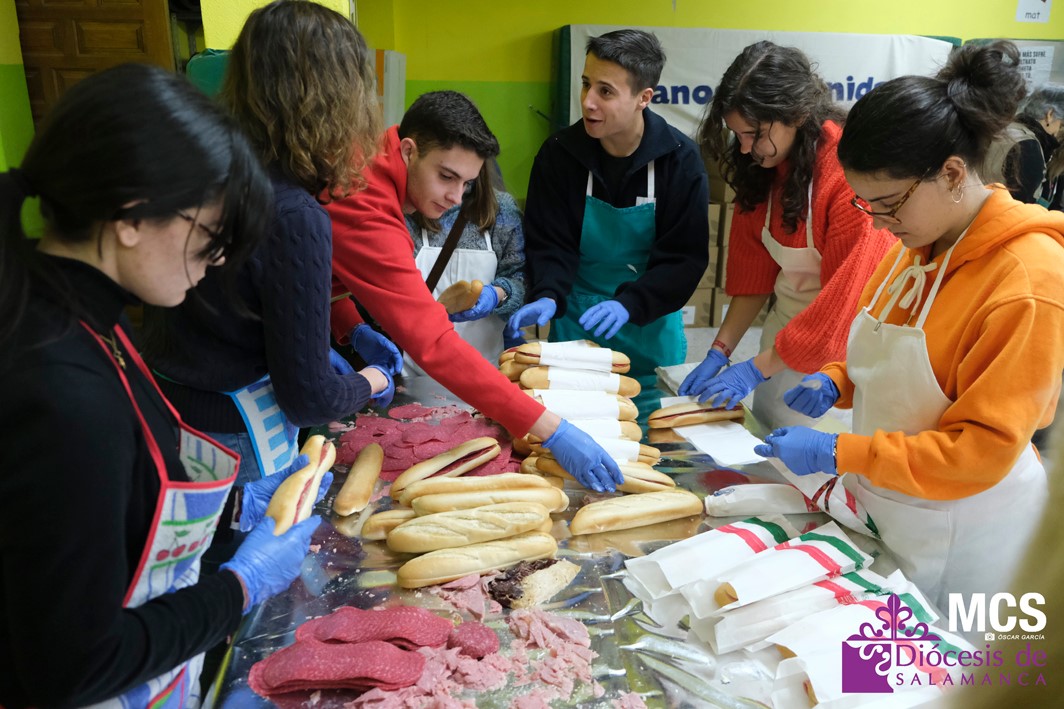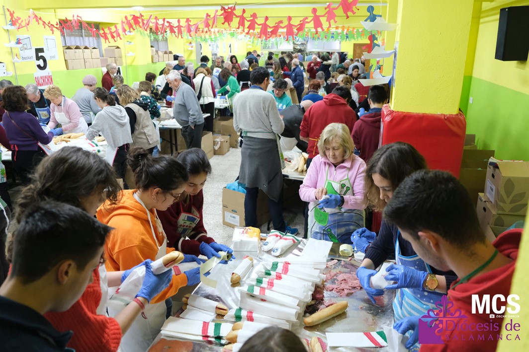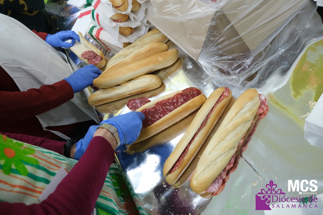 Desde las seis de la madrugada, más de 160 voluntarios ya estaban organizados en mesas para ir rellenando los bocadillos de chorizo, salchichón y queso. Hasta 18.000 unidades que horas más tarde han sido repartidos en centros educativos, universidades, parroquias, centros de trabajo… hasta un total de 70 puntos de reparto de la capital y provincia.