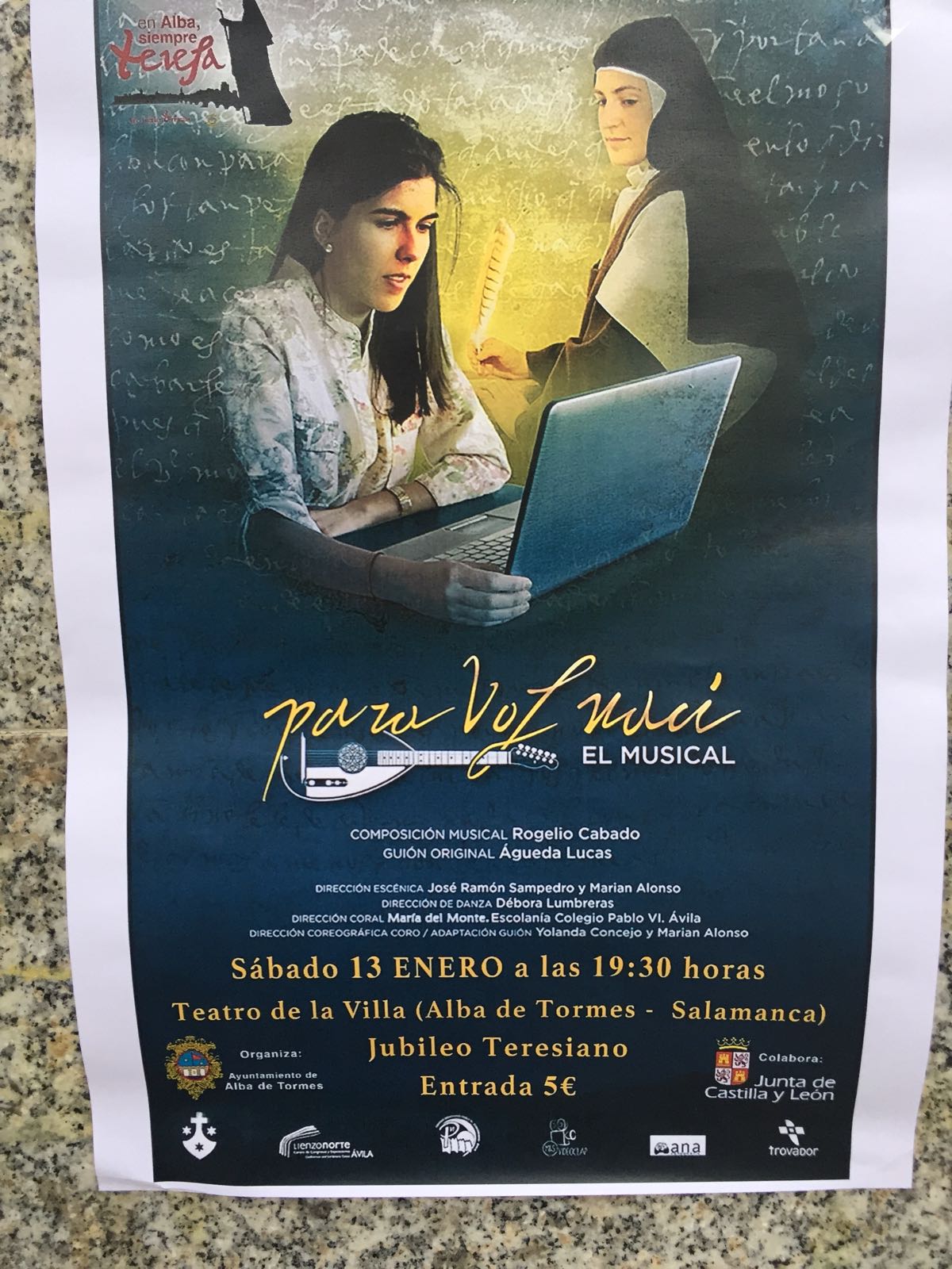 El musical “Para vos nací”, sobre la vida de Santa Teresa de Jesús, se pondrá en escena en el Teatro de Alba de Tormes el próximo 13 de enero, con ocasión del Año Jubilar Teresiano concedido por la Penitenciaría Apostólica a la Iglesia del Monasterio de la Anunciación del Señor. Las entradas cuestan 5€ y se pondrán a la venta el 2 de enero en el Ayuntamiento de Alba de Tormes, en horario de 10.00 a 14.00 horas. También pueden adquirirse el 13 de enero, una hora antes de la actuación, en el Teatro de Alba.
