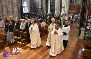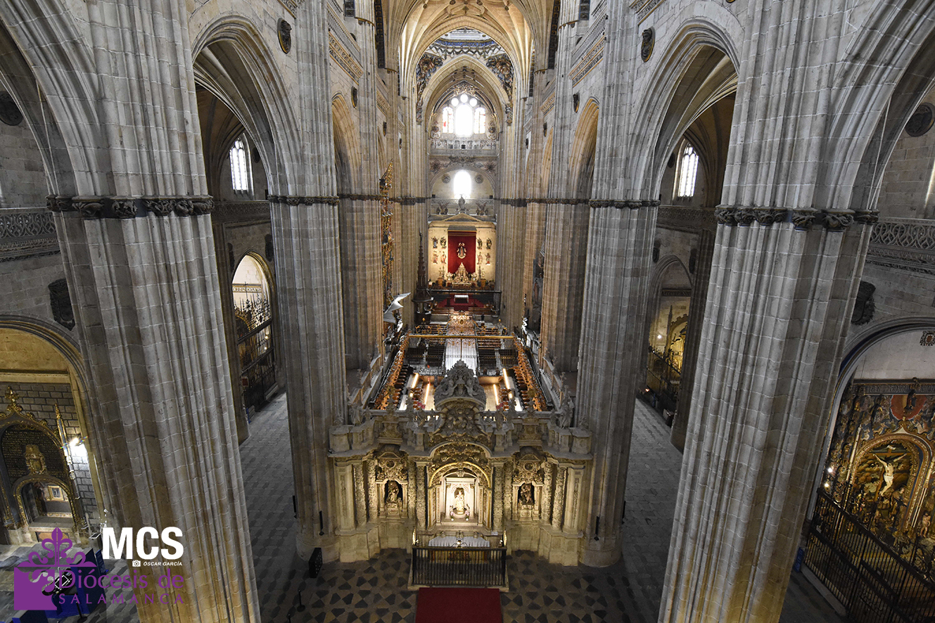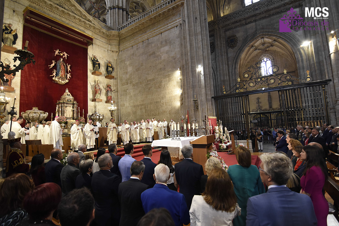Pero toda explosión de arte, de industria y de creatividad intelectual y musical no habría sido posible sin la fe en nuestro Señor Jesucristo y en su Santísima Virgen bajo las invocaciones de La Vega o de la Asunción, o de La Soledad. Todo eso es fruto de la decisión de la diócesis de Salamanca, decisión de dedicar este templo a Nuestra Señora de la Asunción. Le pedimos a ella que nos sostenga en el esfuerzo de mantener este legado artístico y monumental y que todo él pueda seguir dialogando con las nuevas aportaciones del arte, de la técnica y de la cultura. La catedral no es una iglesia cerrada, sino abierta a todos. Y ya que estamos en ello, hay que destacar también la aportación de las colectas y los beneficios para ayudar a Cáritas y a otras instituciones. Un agradecimiento grande a Vds. que mantienen el culto divino participando en las celebraciones litúrgicas de la catedral y otro agradecimiento grande a los turistas que, pagando su entradita, cual mecenas contemporáneos, anónimos y democráticos, nos ayudan a llevar a cabo todos los fines de la catedral.