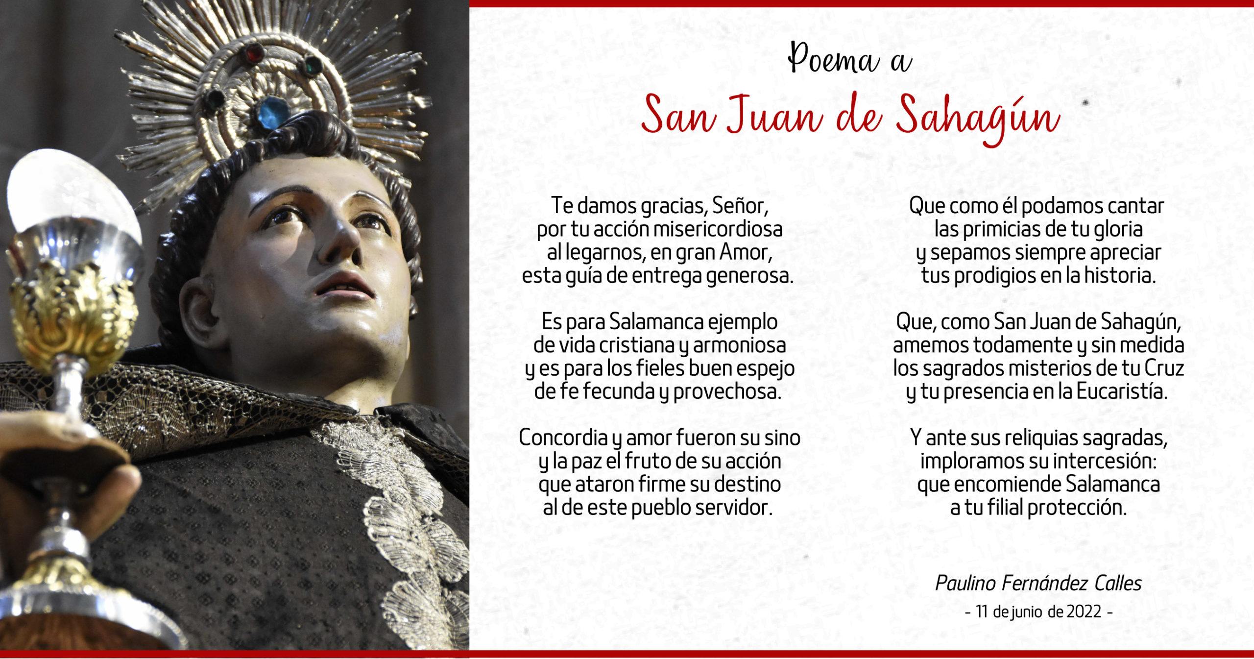 Leer hoy vidas de santos nos permite reconocer sobre estas mismas tierras salmantinas cómo otros han seguido sobre ellas las huellas de Cristo a lo largo de los siglos. Acogernos a su intercesión y patrocinio nos ayuda a rezar al Padre como ellos mismos lo hicieron, con plena confianza. Conocer mejor a San Juan de Sahagún y a todos nuestros santos más cercanos nos señalará en ellos los dones del Espíritu Santo que pedimos para nosotros en esta hora de la Historia.