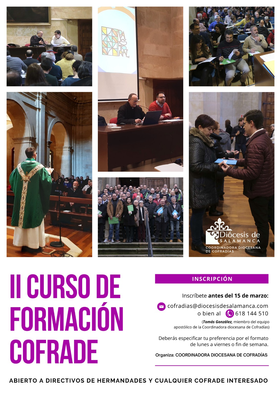 El plazo de inscripción ya está abierto y concluye el 15 de marzo. Los interesados en participar deberán comunicarlo remitiendo sus datos personales al correo electrónico cofradias@diocesisdesalamanca.com o bien por whatsapp al teléfono 618 144 510, especificando si prefieren el formato de fin de semana u otro con sesiones de lunes a viernes, en la tarde. “Dada la situación actual se intentaría organizar de la mejor manera en fechas posteriores a la Semana Santa, que se anunciarán más adelante”, ha adelantado Tomás González, miembro del equipo apostólico de la Coordinadora.