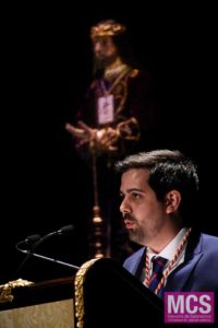 Para este joven pregonero, su primera línea es Jesús. Y se lo dijo directamente al que tenía a su lado, al Divino Redentor Rescatado, en cuyo templo de San Pablo fue bautizado un 8 de noviembre de 1987. “¿Cómo no ibas a ser entonces tú quien me acompañara aquí hoy para anunciar a mis paisanos, a tus paisanos, la llegada anual de la conmemoración de tu Pasión, Muerte y Resurección?”. Y abrió su corazón para desvelar los motivos por los que escogió la Real Cofradía del Cristo Yacente, “fue en tu rostro en Agonía Redentora donde encontré al hombre”, porque considera que cuántas diferencias entre ambos (Divido Redentor y Agonía Redentora), “mi Cristo y mis cristos, a quien suelo dirigir mis plegarias, torponas y frágiles”. Sobre el escenario del teatro Liceo también quiso que estuviese presente su hábito de la madrugada ya de Jueves Santo.