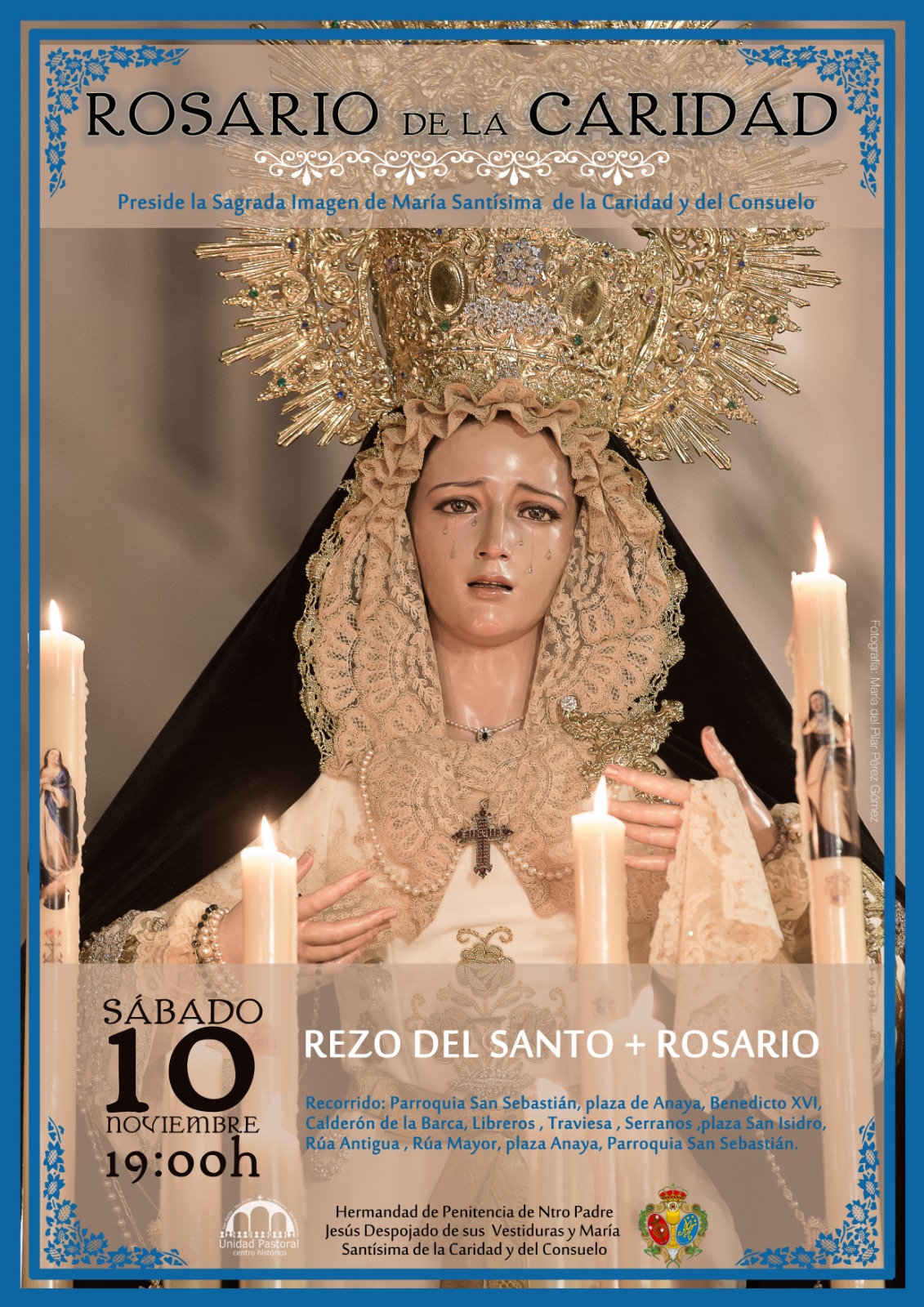Los actos concluirán el sábado 10 de noviembre con el Rezo de Santo Rosario que se iniciará a las 19.00 horas en la iglesia de San Sebastián y realizará un recorrido por la Plaza de Anaya, calles Benedicto XVI, Calderón de la Barca, Libreros, Traviesa, Serranos, Plaza San Isidro, Calle Antigua y Rúa Mayor hasta llegar de nuevo a la Parroquia San Sebastián.