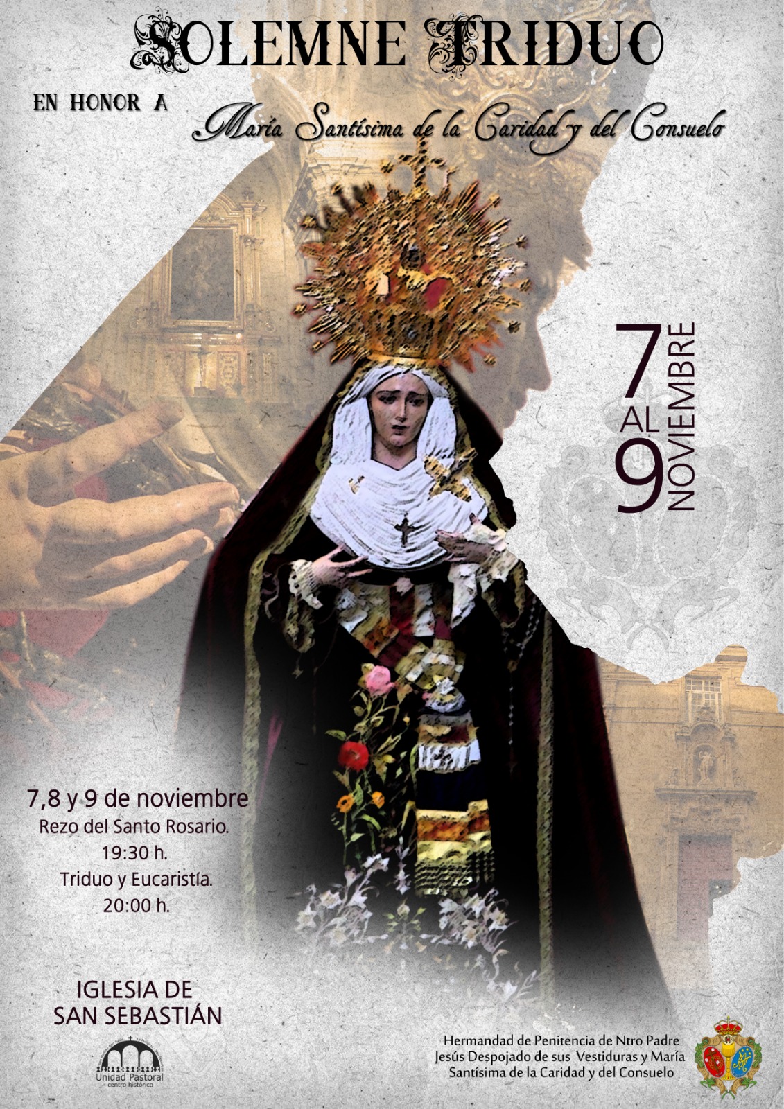 La Hermandad de Penitencia de Nuestro Padre Jesús Despojado de sus vestiduras y María Santísima de la Caridad y del Consuelo organiza un solemne triduo en honor a la Virgen del 7 al 9 de noviembre en la iglesia de San Sebastián. Habrá rezo del Santo Rosario a las 19.30 horas seguido del Triduo y la Eucaristía, esta última será presidida cada día por un sacerdote: su director espiritual D. Alfredo Fernández Giménez; D. Antonio Matilla, párroco de la Unidad pastoral centro Histórico y el P. Isidro Núñez Gómez scj.