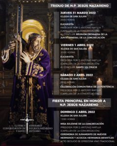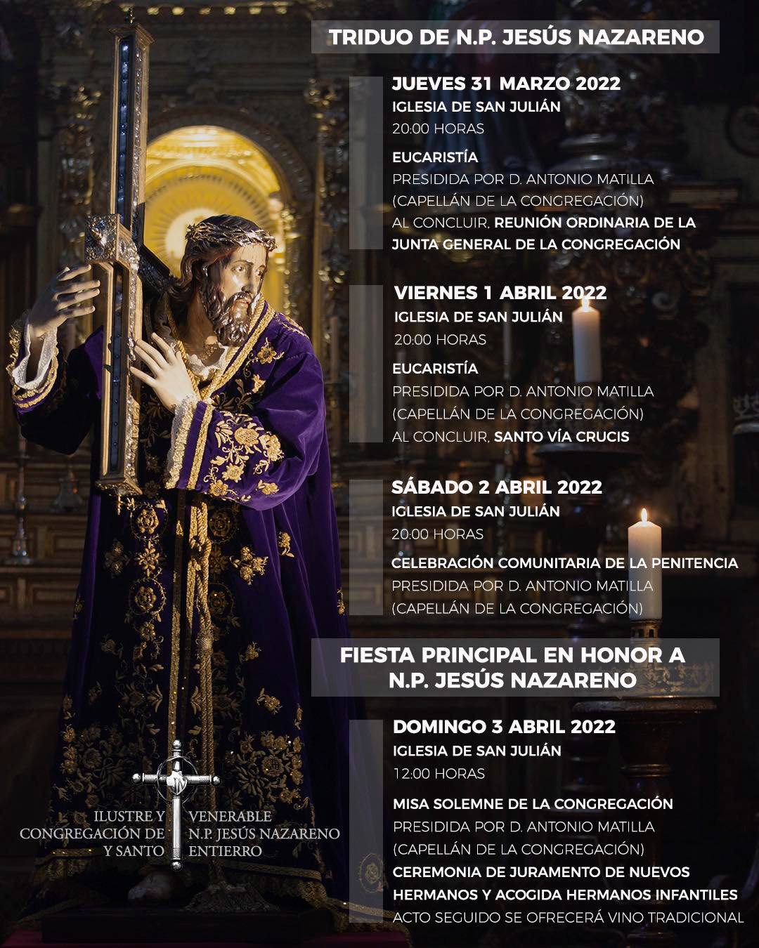 20:00 HORAS. NAZARENO. Triduo a Nuestro Padre Jesús Nazareno del 31 de marzo al 2 de abril, en la iglesia de San Julián, a las 20:00 horas. El domingo, 3 de abril, la fiesta principal se celebrará a las 12:00 horas.