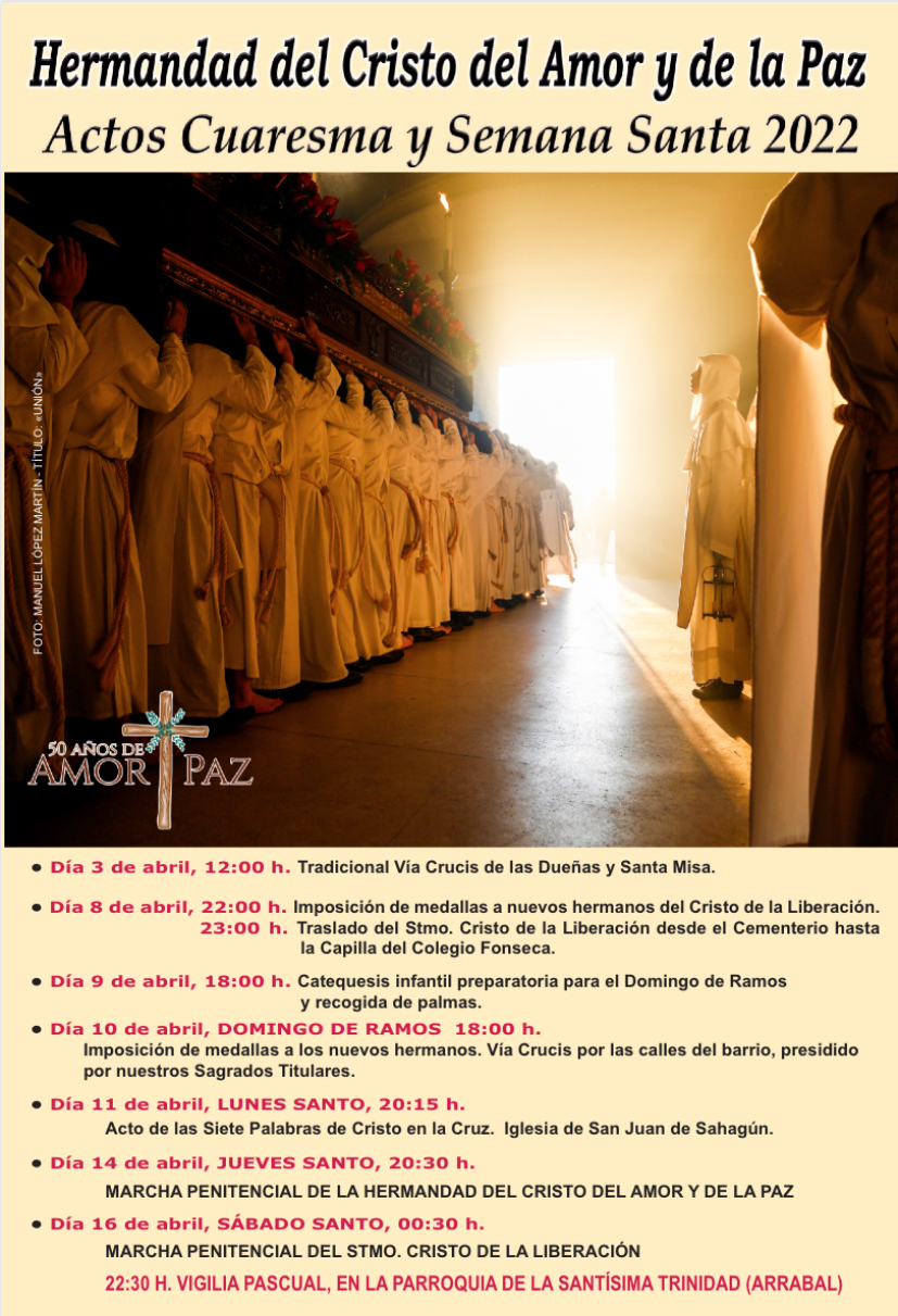20:15 HORAS. AMOR Y PAZ. La Hermandad del Cristo del Amor y de la Paz celebra en la iglesia de San Juan de Sahagún la meditación colectiva sobre las últimas Siete Palabras de Cristo en la Cruz. Más información en este enlace.