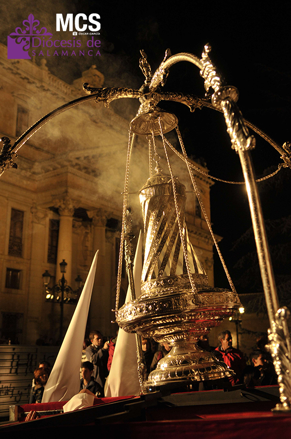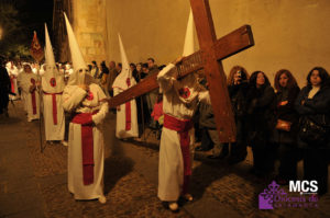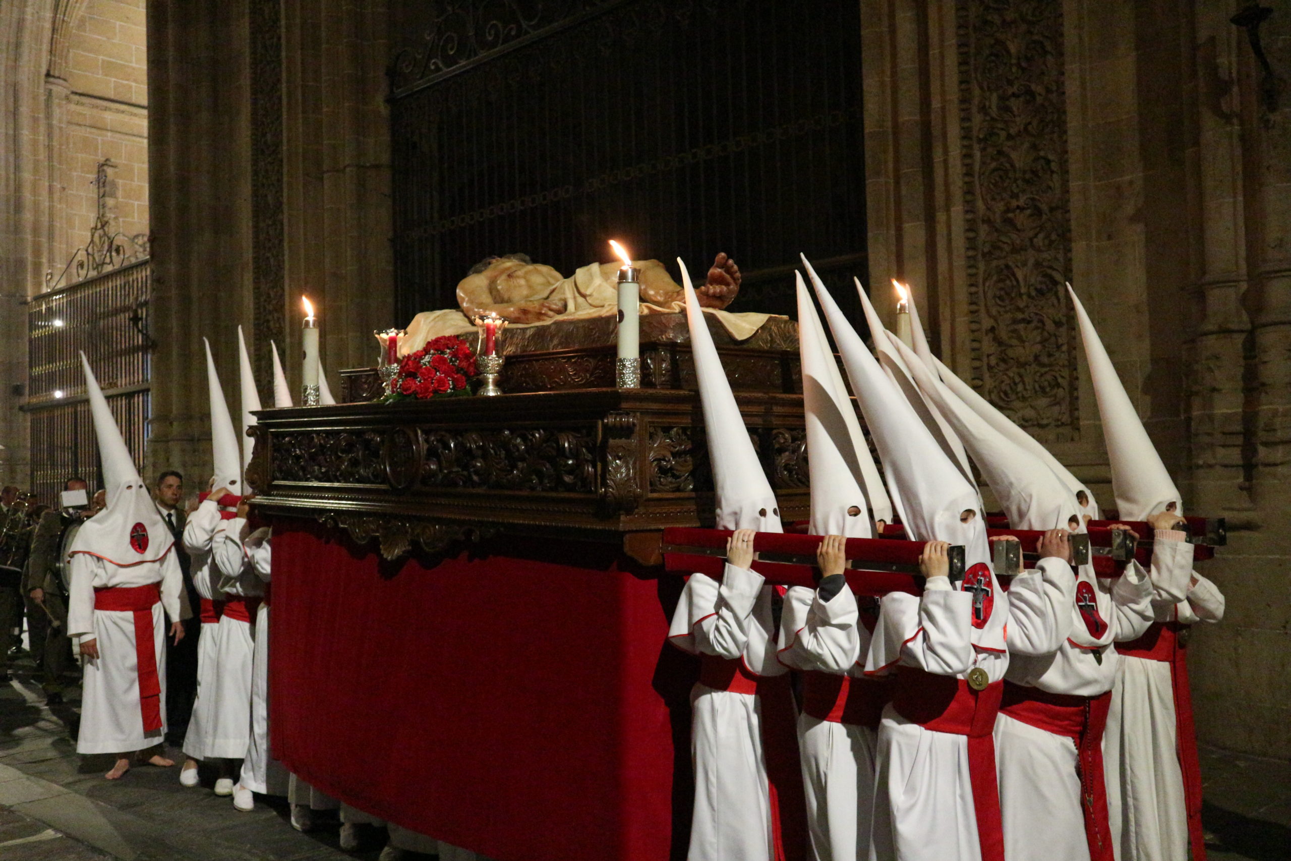 Su cortejo del Jueves Santo comienza con un hermano pidiendo silencio con dos campanas, y detrás, un gran incensario, portado por varios hermanos y que es copiado del botafumeiro de Santiago de Compostela. El hábito de los cofrades no lleva capa, con túnica blanca, fajín rojo y un capirote de 90 centímetros, “hasta este año era el más alto”, y unas sandalias de esparto.