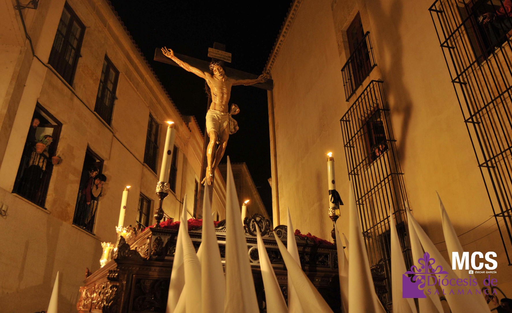 En este acto, ante una repleta plaza de Anaya, también interviene el alcalde de la ciudad, Carlos García Carbayo, y también lo hará el vicario general, Florentino Gutiérrez, representando a la Iglesia de Salamanca. El hermano mayor es Julián Alcántara, recuerda que la cofradía realiza su desfile penitencial con dos imágenes, el Cristo de la Agonía Redentora, la más antigua de la Semana Santa, de 1525, atribuido a Juan de Valmaseda, y el Yacente de la Misericordia, de Enrique Orejudo, de 1991.