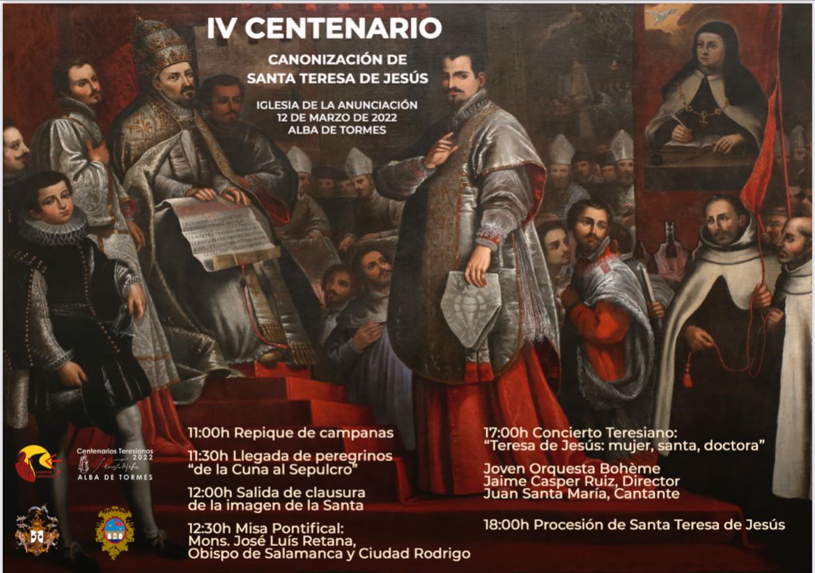 El 12 de marzo se celebra el cuarto centenario de la subida a los altares de Santa Teresa de Jesús. Un acontecimiento histórico que tuvo lugar en 1622 en la ciudad de Roma. Junto a la fundadora de la Orden de los Carmelitas descalzos, el papa Gregorio XV también canonizó a los beatos Isidro Labrador, Ignacio de Loyola, Francisco Javier y Felipe Neri.
