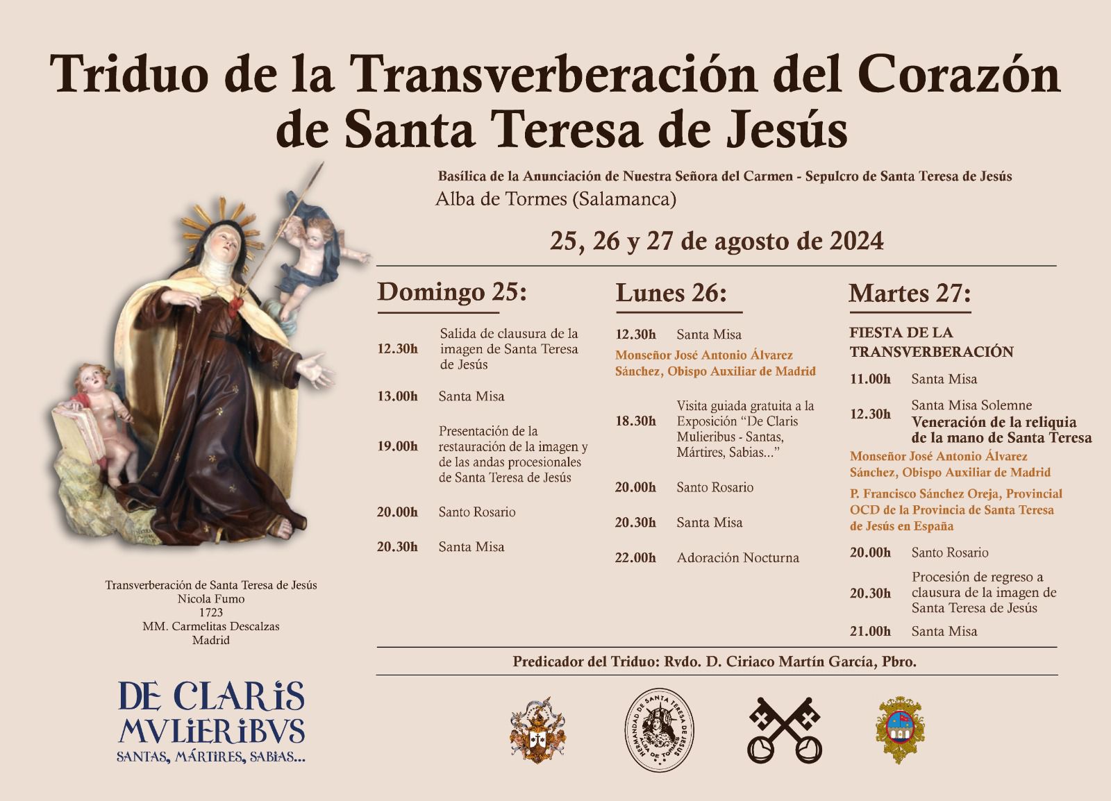 El triduo se prolongará del 25 al 27 de agosto, y comenzará el domingo con la salida de clausura de la imagen de Santa Teresa a las 12:30 horas, y posterior eucaristía a las 13:00. Por la tarde, tendrá lugar el rosario y el triduo a las 20:00, y la eucaristía, a las 20:30 horas. Ese mismo día, a las 19:00 horas, se presentará la restauración de la imagen y de las andas procesionales de Santa Teresa de Jesús.
