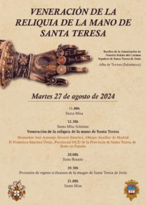 La fiesta de la Transverberación tendrá una novedad este año con la veneración de la reliquia de la mano de Santa Teresa que custodian las hermanas carmelitas de Ronda. Se trasladará a Salamanca para el estudio que realizarán del sepulcro y las reliquias. En concreto, será en la misa solemne de las 12:30 horas, presidida por el obispo auxiliar de Madrid, Mons. José Antonio Álvarez, junto al P. Provincial OCD de la provincia de Santa Teresa en España, Francisco Sánchez Oreja. Asimismo, se celebrará una misa a las 11:00 horas.