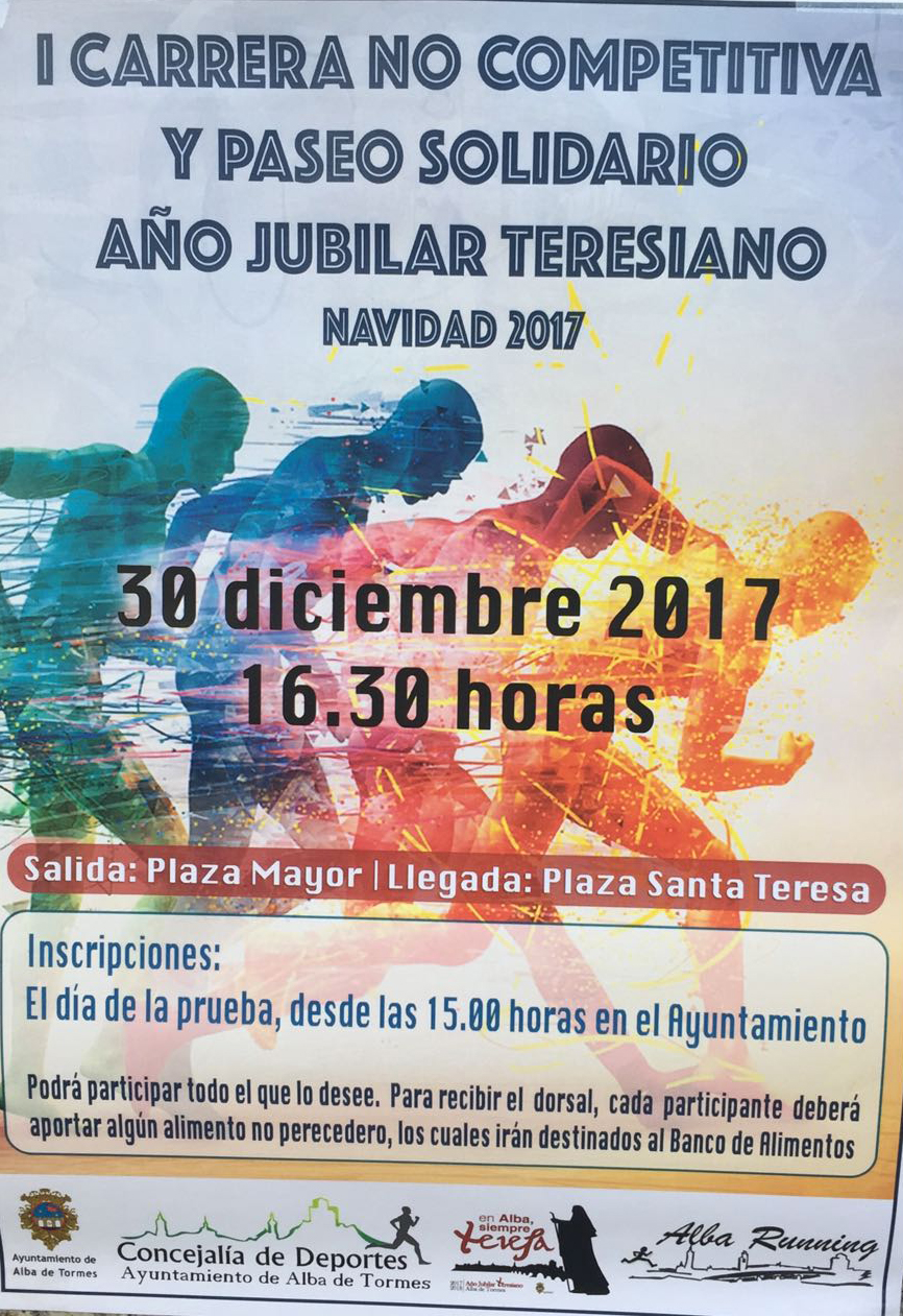 La Concejalía de Deportes del Ayuntamiento de Alba de Tormes junto con el club Alba Running organizan la I Carrera no competitiva y Paseo Solidario Año Jubilar Teresiano que se va a celebrar el sábado 30 de diciembre en la localidad. La prueba dará comienzo a las 16.30 de la tarde en la Plaza Mayor de Alba y concluirá en la Plaza de Santa Teresa. Está abierta a participantes de todas las edades.
