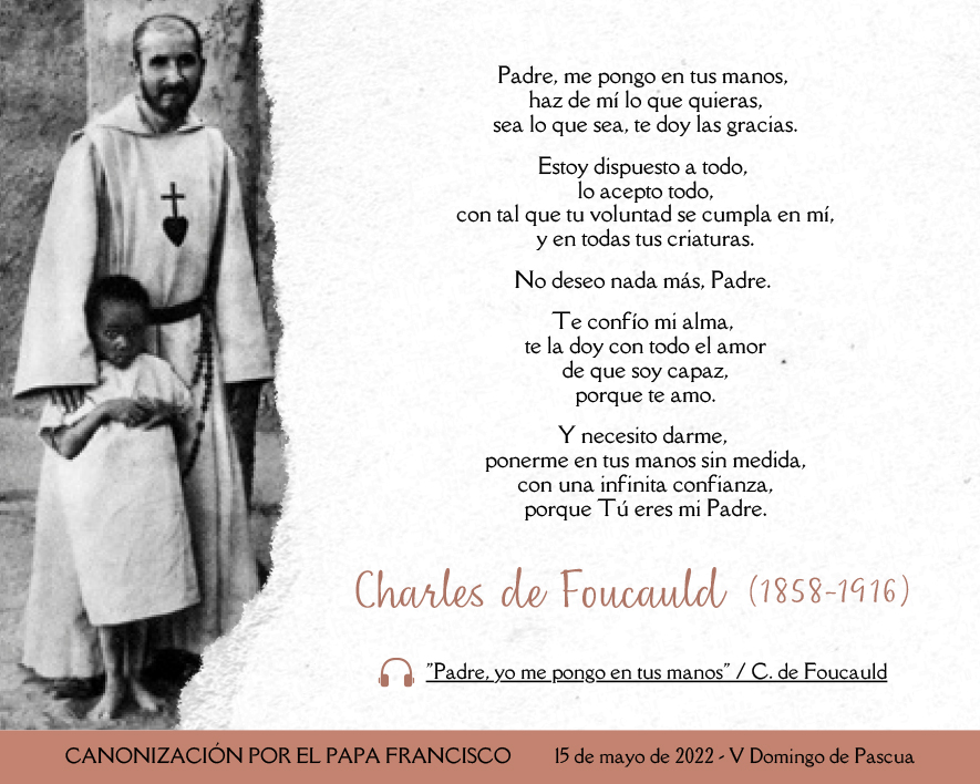 El carisma de Charles de Foucauld parece ser el de recordarnos a todos los que recorremos este comienzo del Tercer Milenio, que la imitación de Jesucristo sigue siendo una constante en la vida de los discípulos misioneros. Y es que es realmente necesario, que en cada época surjan hombres y mujeres que se atrevan a vivir más intensamente según la forma de vida evangélica, para recordarnos a todos cuál es el núcleo esencial de nuestra vida cristiana. Por eso la canonización de este santo, hoy, V domingo de Pascua, es una auténtica Gracia.