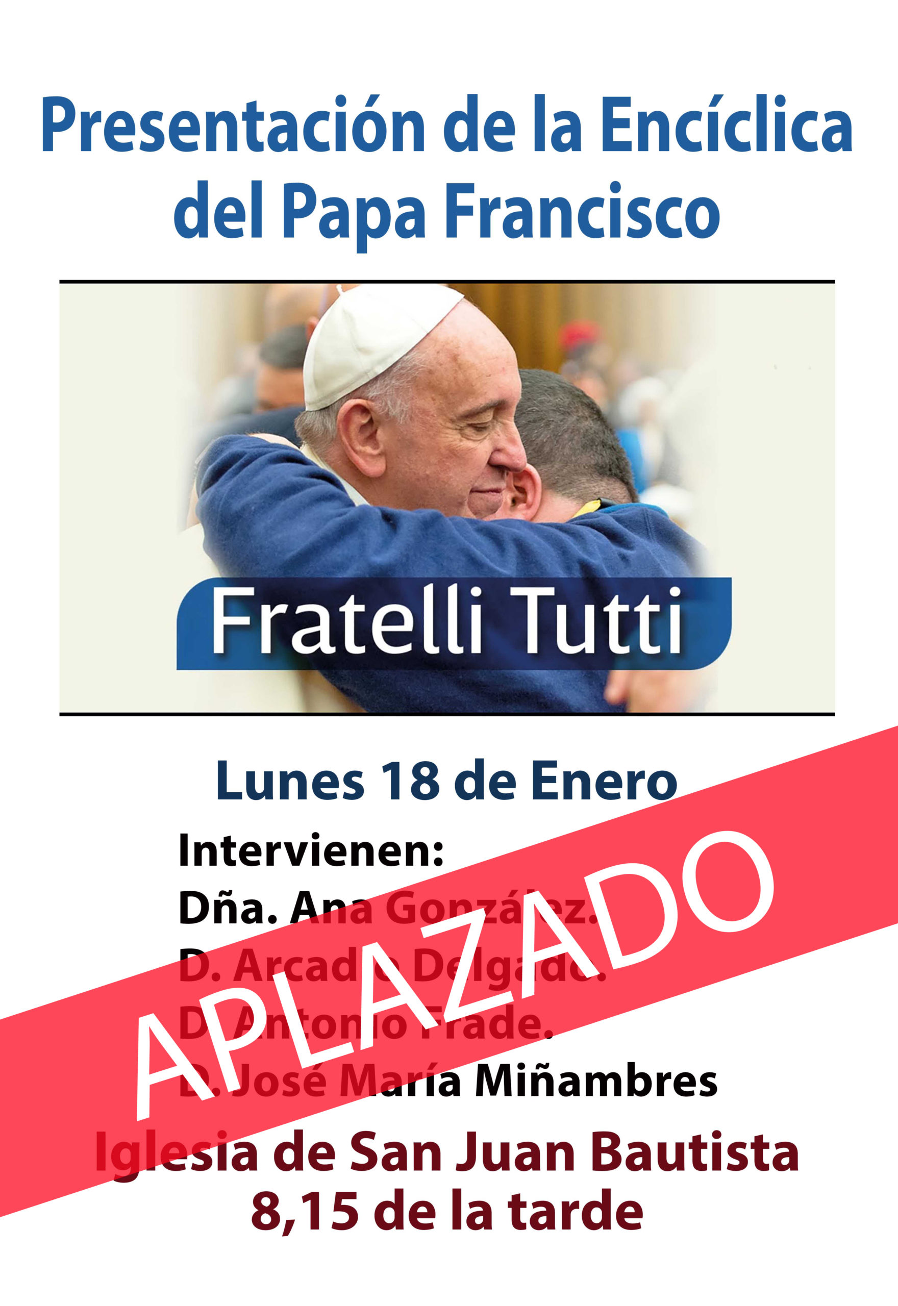 Debido al empeoramiento de la situación sanitaria provocada por la pandemia y ante las nuevas medidas adoptadas por la Junta de Castilla y León para luchar contra el coronavirus, los organizadores de este evento han decidido aplazar su celebración. La presentación de la encíclica del Papa se iba a celebrar el lunes 18 de enero, a las 20.15 horas, y estaba previsto que intervinieran Ana González, Arcadio Delgado, Antonio Frade y el párroco de la unidad pastoral, José María Miñambres.